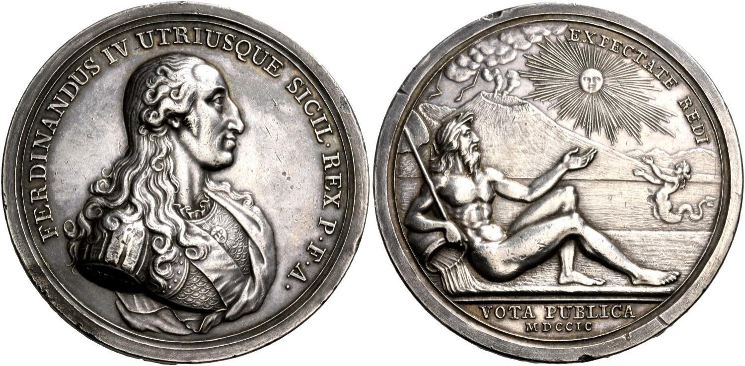 in esergo: PER MEZZO DELLA DIVINA PROVVIDENZA DELLE = DI LUI VIRTU' DELLA FEDE & ENERGIA DEL SUO POPOLO = DEL VALORE DEI SUOI ALLEATI ED IN = PARTICOLARE GL'INGLESI GLORIOSTE = RISTABILIRO SUL TRONO. = LI 10 • LUGLIO • 1799 •