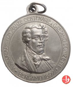 100° Gaetano Donizetti 1897 Obverse: A RICORDO DELL'ONORANZE CENTENARIE A GAETANO DONIZETTI = • BERGAMO 1897 • busto di 3/4 a dx con camicia, papillon e giacca a sx, presso il bordo interno: JOHNSON | |