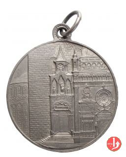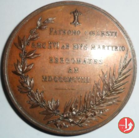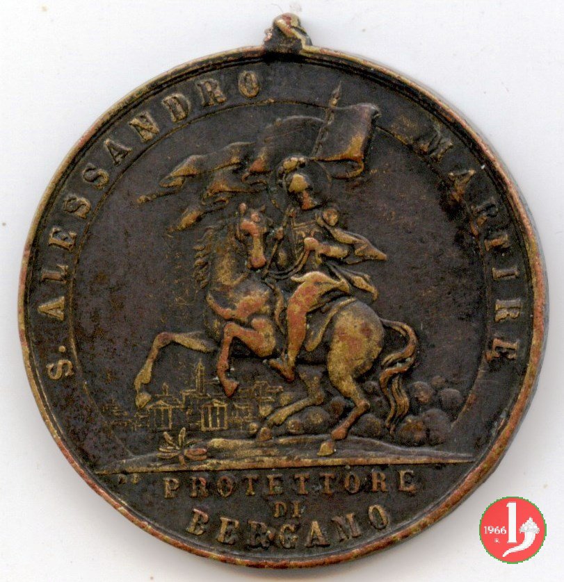 S. Alessandro Martire 1600° Martirio 1898 Obverse: S. ALESSANDRO _ MARTIRE Il santo a cavallo, verso sx, regge stendardo, sullo sfondo panorama della Città di Bergamo in esergo: PROTETTORE = DI = BERGAMO in basso a sx: S.J. Reliquia riccamente decorata e sormontata da statuetta sotto, entro nastro: 1898 | |