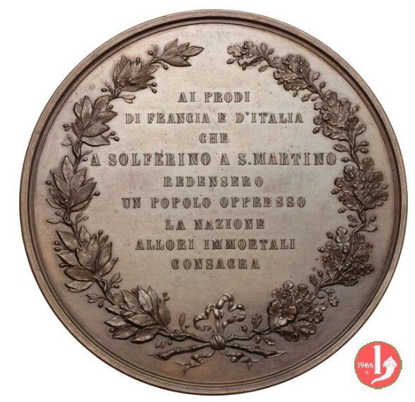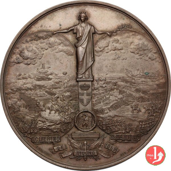 Battaglia di Solferino e San Martino 24-06-1859 Obverse: figura allegorica dell'Italia turrita, in piedi, su base ornata da Stemma Savoia coronato e da aquila entro ghirlanda d'alloro, regge rami d'ulivo sullo sfondo: scena della Battaglia in basso, entro nastro: SOLFERINO _ 24 _ GIUGNO _ 1859 _ S. MARTINO ai lati, in basso: GRAZIOLI _ DIS. INC. | |