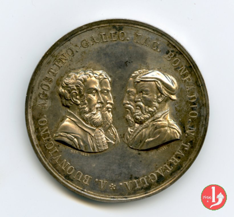 Ateneo di Brescia 1822 Obverse: A • BUONVICINO • AGOSTINO • GALLO • IAC • BONFADIO • N • TARTAGLIA I quattro busti affiancati appaiati sotto: NEL 1822 _ F. PUTINATI F. nel campo entro rami d'alloro: A. | |