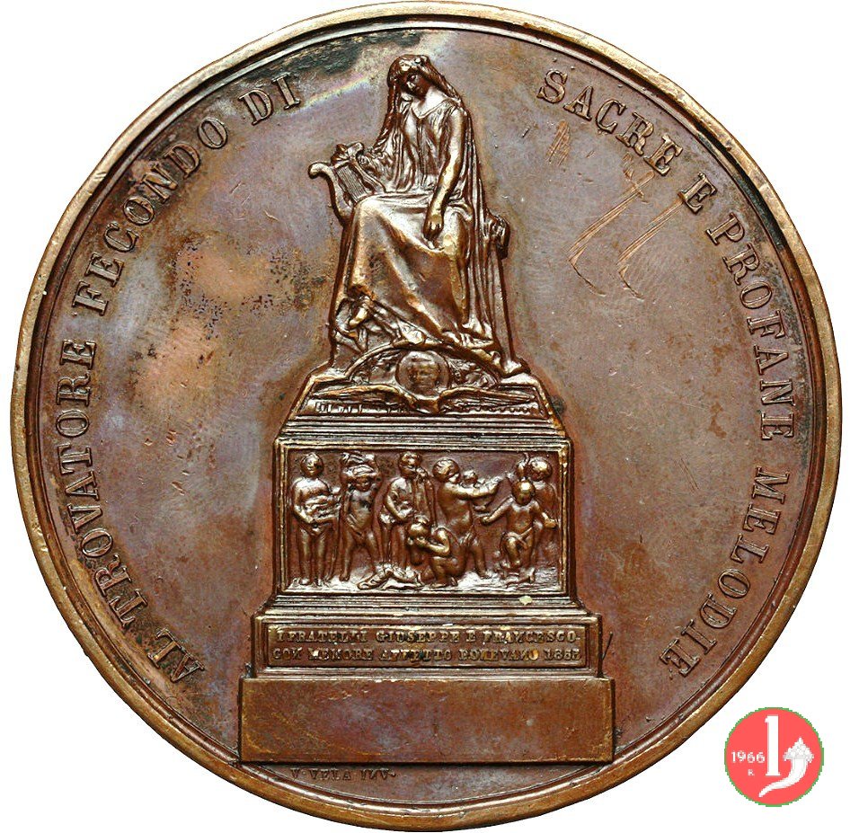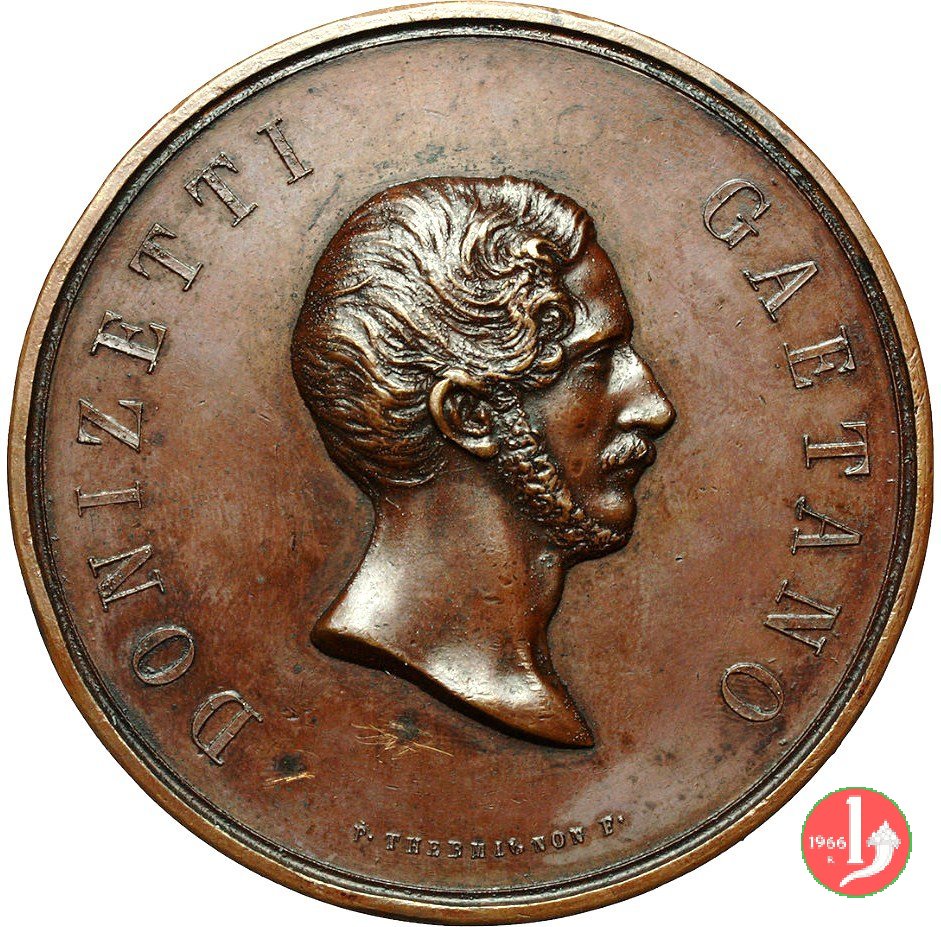 Gaetano Donizetti - Sepolcro 1853 Obverse: DONIZETTI _ GAETANO busto nudo a dx sotto: P • THERMIGNON F • La Tomba di Donizetti in Santa Maria Maggiore a Bergamo sulla base: I FRATELLI GIUSEPPE E FRANCESCO = CON MEMORE AFFETTO PONEVANO 1853 in esergo, a sx: V • VELA • INV • | |