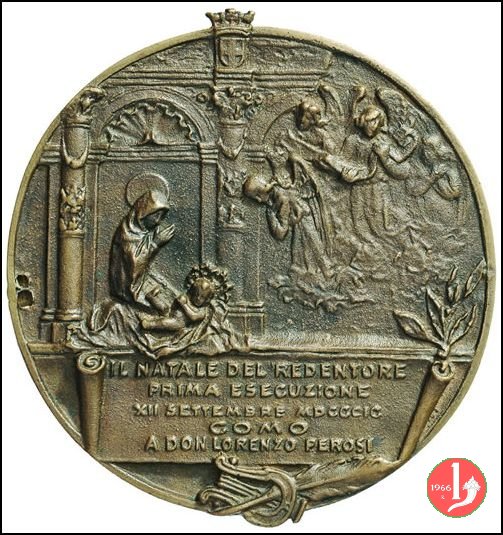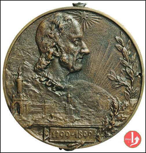 Alessandro Volta-Il Natale del Redentore 1899 Obverse: testa di Alessandro Volta a sx con stella raggiante in fronte e su foglia di quercia sullo sfondo, a dx: sole nascente in basso, entro targa: 1799 • 1899 a dx: ramo d'alloro in basso, entro targa: IL NATALE DEL REDENTORE = PRIMA ESECUZIONE = XII SETTEMBRE MDCCCIC = COMO = A DON LORENZO PEROSI | |