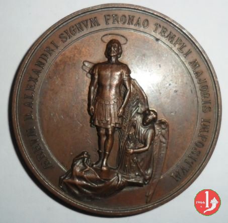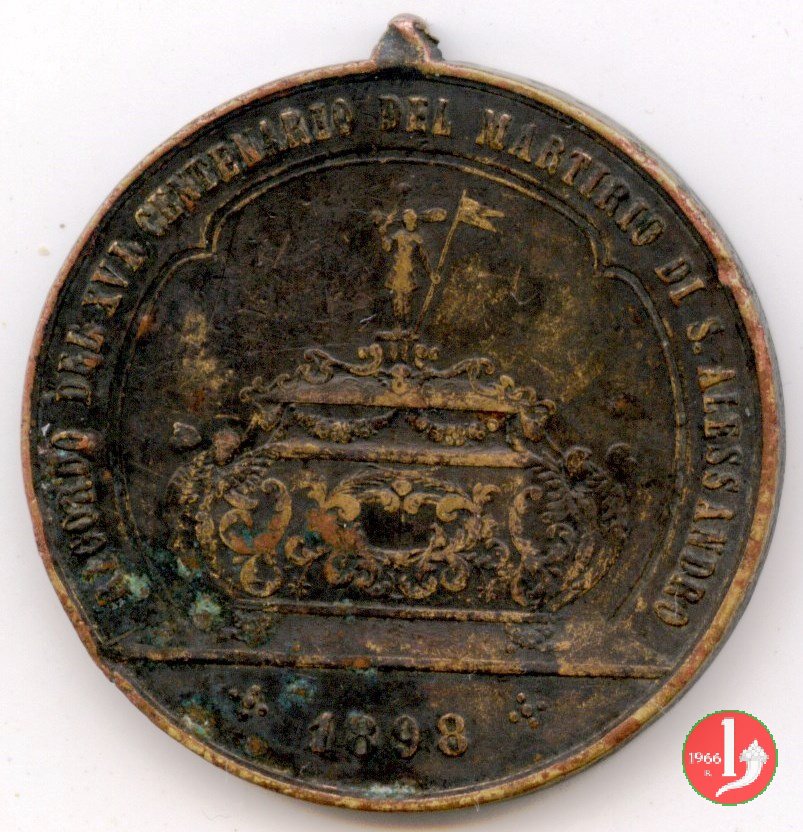 S. Alessandro Martire 1600° Martirio 1898 Obverse: AERVM D. ALEXANDRI SIGNVM PRONAO TEMPLI MAJORIS IMPOSITVM Sant'Alessandro nimbato, in piedi con corazza e a dx Angelo regge ramo di palma in basso a sx: S.J. | |