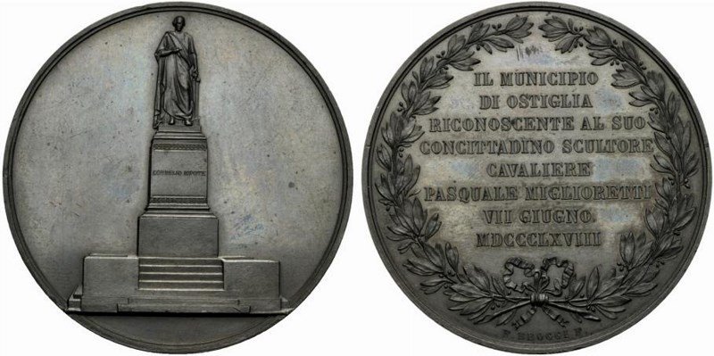Ostiglia - Pasquale Miglioretti 1868 Obverse: prospetto anteriore del Monumento a Cornelio Nepote in Ostiglia Reverse: tra rami d'alloro, legati in basso da nastro: IL MUNICIPIO = DI OSTIGLIA = RICONOSCENTE AL SUO = CONCITTADINO SCULTORE = CAVALIERE = PASQUALE MIGLIORETTI = VII GIUGNO = MDCCCLXVIII in basso: F. BROGGI F. | |