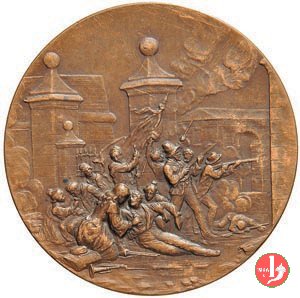 Ricordo delle Dieci Giornate 1886 Obverse: DECADE 1849 scena di combattimento e sullo sfondo edificio nel campo, entro corona di quercia: A = (PLONA = PIETRO) | |