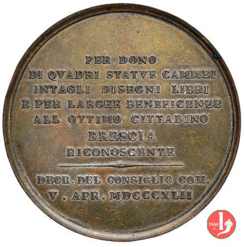 Paolo Tosio 1843 Obverse: G. PAOLO _ TOSIO * testa a dx sotto: ZAPPARELLI nel campo: MDCCCXLIIII | |