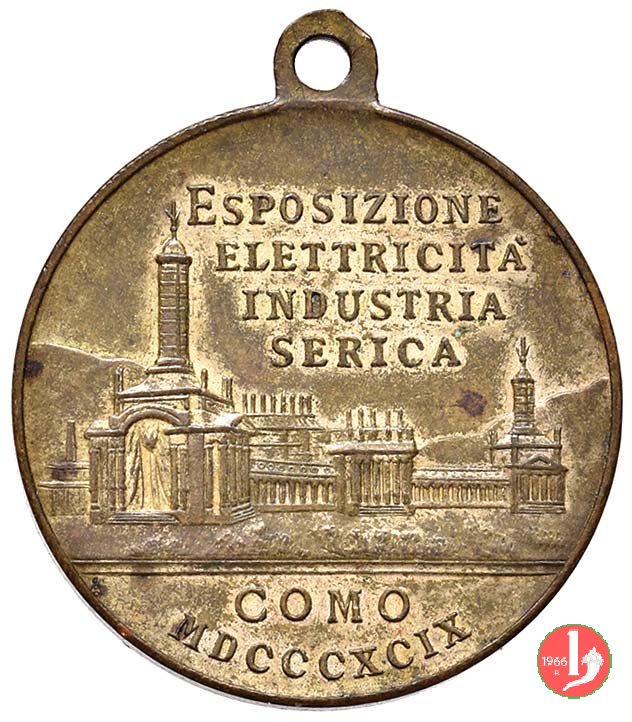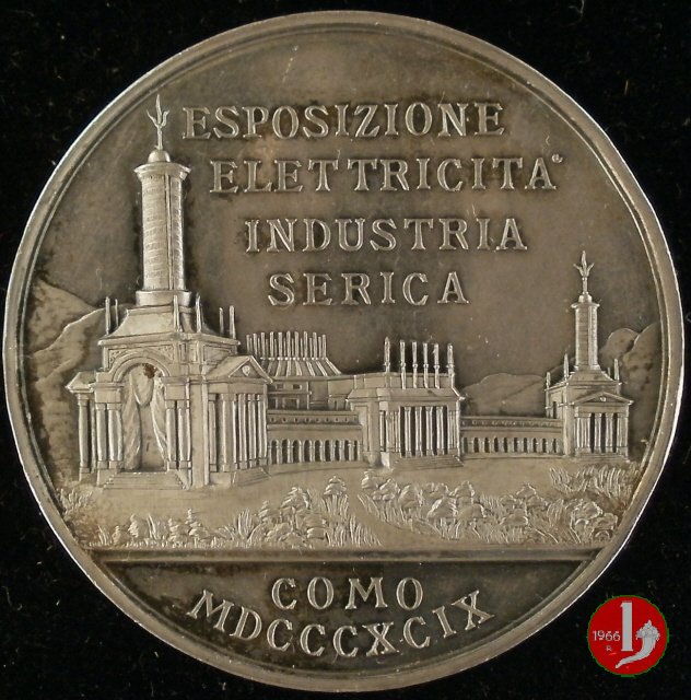 Alessandro Volta-Industria Serica 1899 Obverse: ALESSANDRO VOLTA = * I.° CENTENARIO DELLA PILA * entro cerchio continuo: busto di 3/4 a dx con giubbetto ricamato con rami di palma e foulard in basso, a sx: S.J vista del Padiglione espositivo in esergo: COMO = MDCCCXCIX | |