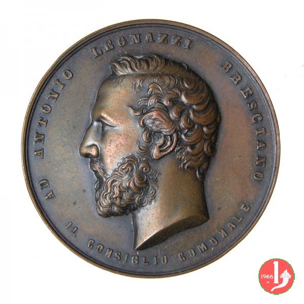 Antonio Legnazzi 1860 Obverse: AD ANTONIO LEGNAZZI BRESCIANO = IL CONSIGLIO COMUNALE testa a sx con barba sotto, corsivo inciso: Zapparelli | |
