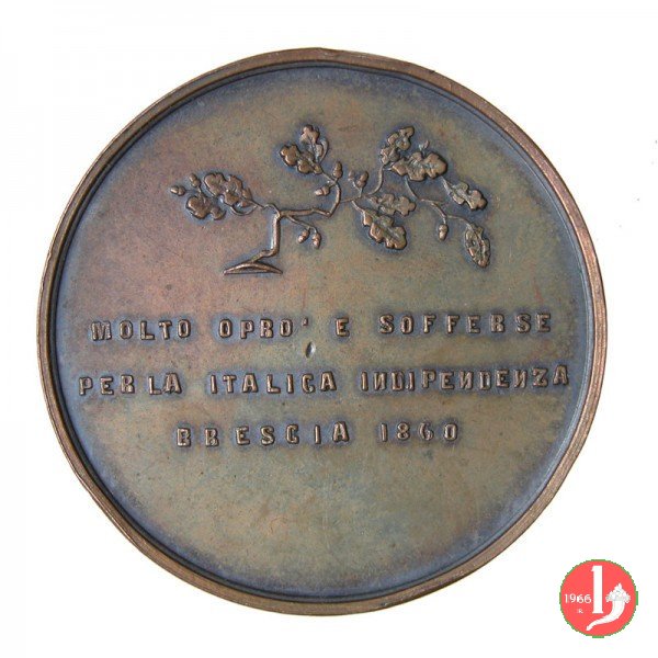 Brescia ad Antonio Legnazzi 1860 Obverse: ANTONIO LEGNAZZI BRESCIANO testa a sx con baffi e barba sotto: INCIS • _ G • ZAPPARELLI nel campo: MOLTO = OPERÒ E SOFFERSE = PER LA ITALICA = INDIPENDENZA = ramo di quercia | |
