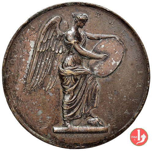 Medaglia della Vittoria Bresciana 1826 Obverse: VITTORIA _ BRESCIANA La figura allegorica della Vittoria alata, in piedi a dx, scrive su scudo in esergo: ZAPPARELLI F. | |