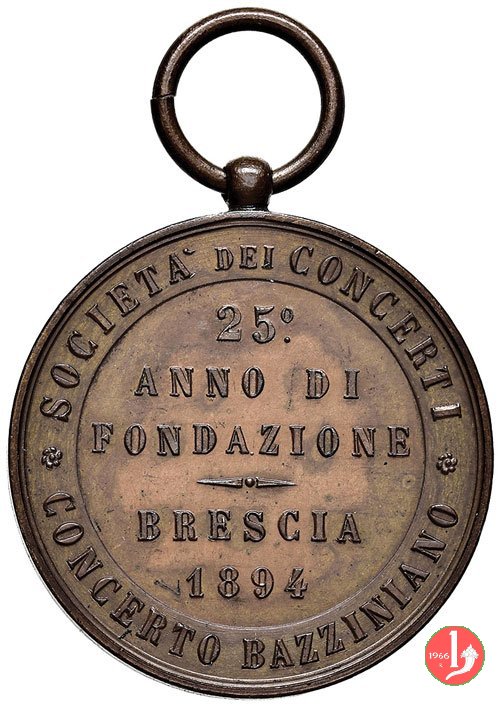 Società dei Concerti - Concerto Bazziniano 1894 Obverse: Spartito, lira, arpa, flauto e corno tra rami d'alloro, sormontati da stella raggiante Reverse: SOCIETA' DEI CONCERTI = * CONCERTO BAZZINIANO * nel campo: 25° = ANNO DI FONDAZIONE = - • - = BRESCIA = 1894 | |