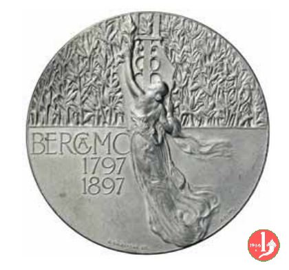 100° Gaetano Donizetti 1897 Obverse: figura femminile drappeggiata, regge torcia e la eleva verso il cielo nel semi-campo superiore: braciere tra vegetazione nel campo a sx: BERGAMO = 1797 = 1897 in basso, a dx: A.C. INC. in basso, a sx: G. CHIATTONE DIS Vista anteriore della Porta dei Leoni rossi della Basilica di Santa Maria Maggiore a Bergamo in basso: JOHNSON - MILANO | |