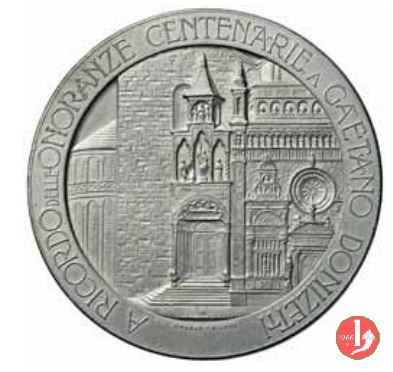 Gaetano Donizetti Obverse: Busto di 3/4 a dx su pentagrammi in basso: R. BRAVI in basso: violino e e ramo d'alloro su spartito musicale | |