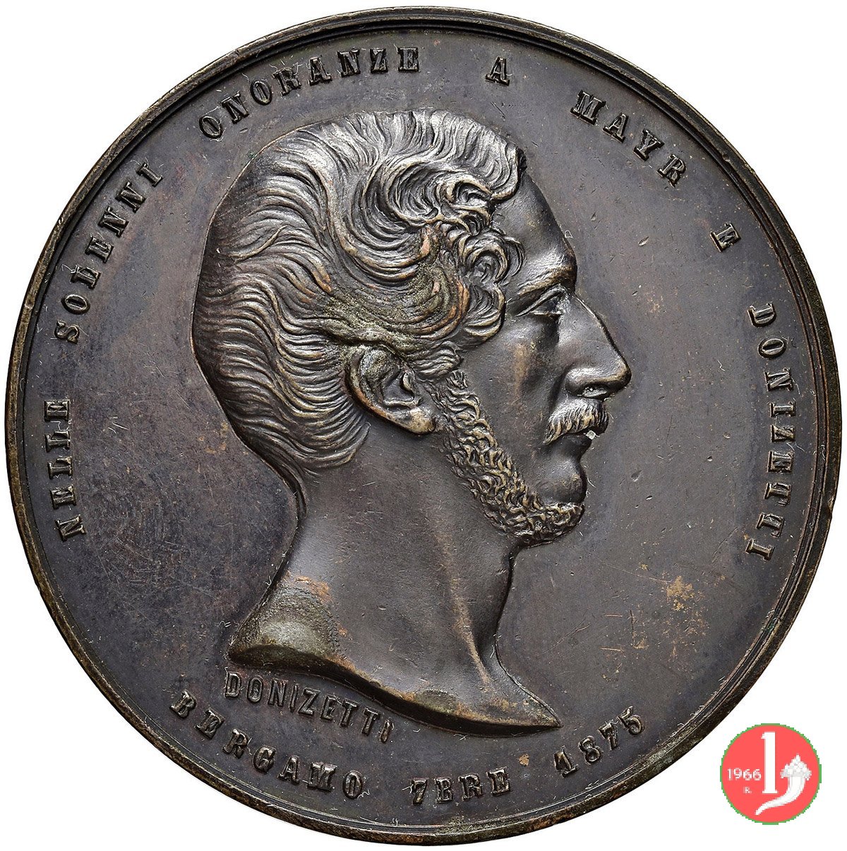 Mayr e Donizetti 1875 Obverse: NELLE SOLENNI ONORANZE A MAYR E DONIZETTI busto nudo a dx sotto: DONIZETTI in basso: BERGAMO 7BRE 1875 sul taglio spalla: A. POJAGHI F sotto: S. MAYR | |