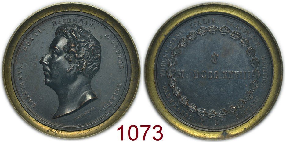 Gaetano Matteo Monti 1828 Obverse: GAITANVS. MONTI. RAVENNAS. SCVLPTOR. EXIMIVS. busto nudo as x sotto: ZAPPARELLI nel campo entro ghirlanda d'alloro: M. DCCC. XXVIII | |