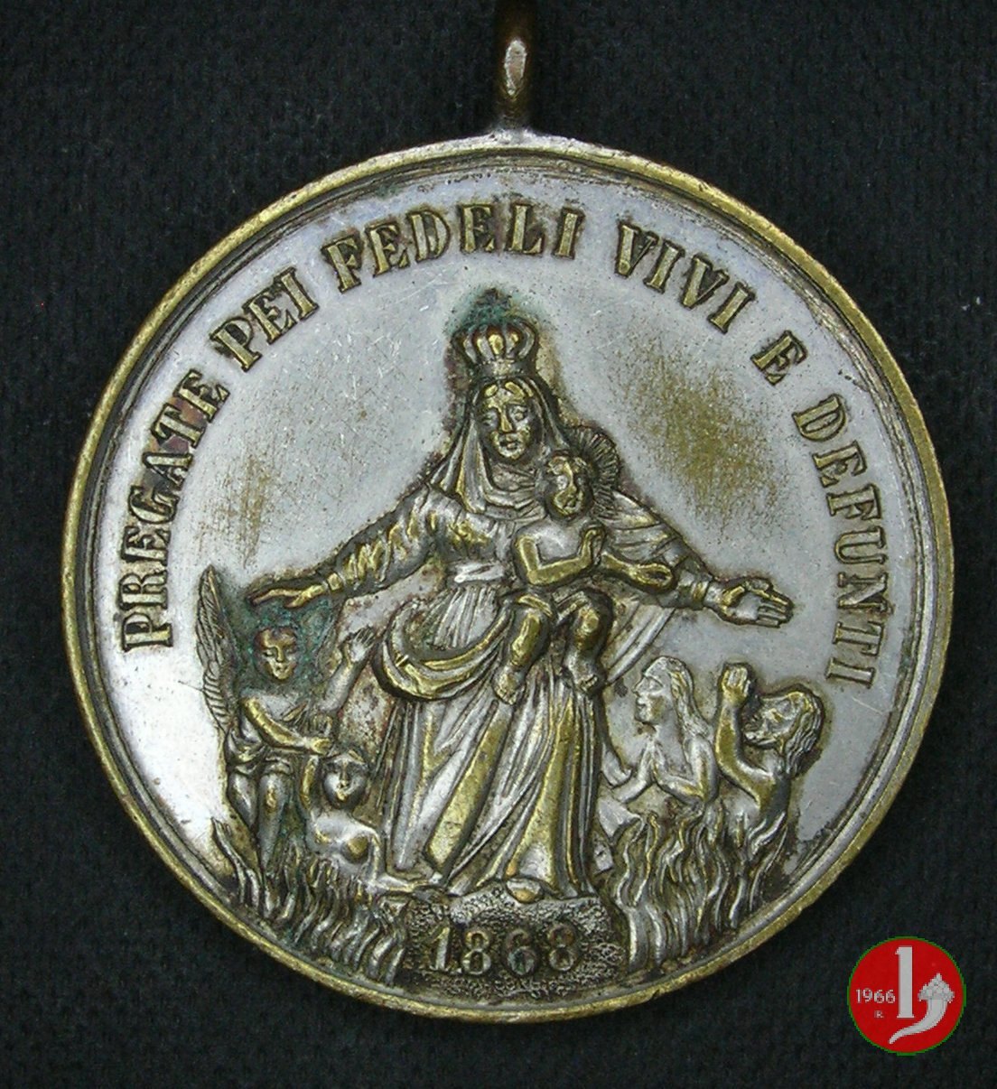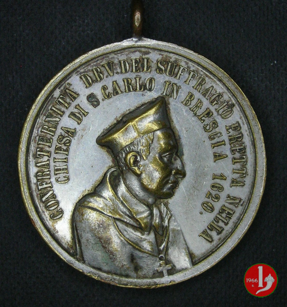 Confraternita del Suffragio 1868 Obverse: CONFRATERNITA' D.B.V. DEL SUFFRAGIO ERETTA NELLA = CHIESA DI SAN CARLO IN BRESCIA 1620. busto a dx di San Carlo Borromeo con cappello, abito talare e Croce pettorale L'a B. V. Maria del Suffragio coronata e velata, a braccia aperte e in piedi su globo, regge il Bambino Gesú col volto raggiante, tra Angelo e figure penitenti tra le fiamme in basso: 1868 | |