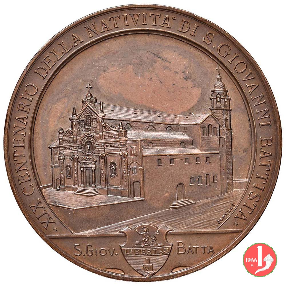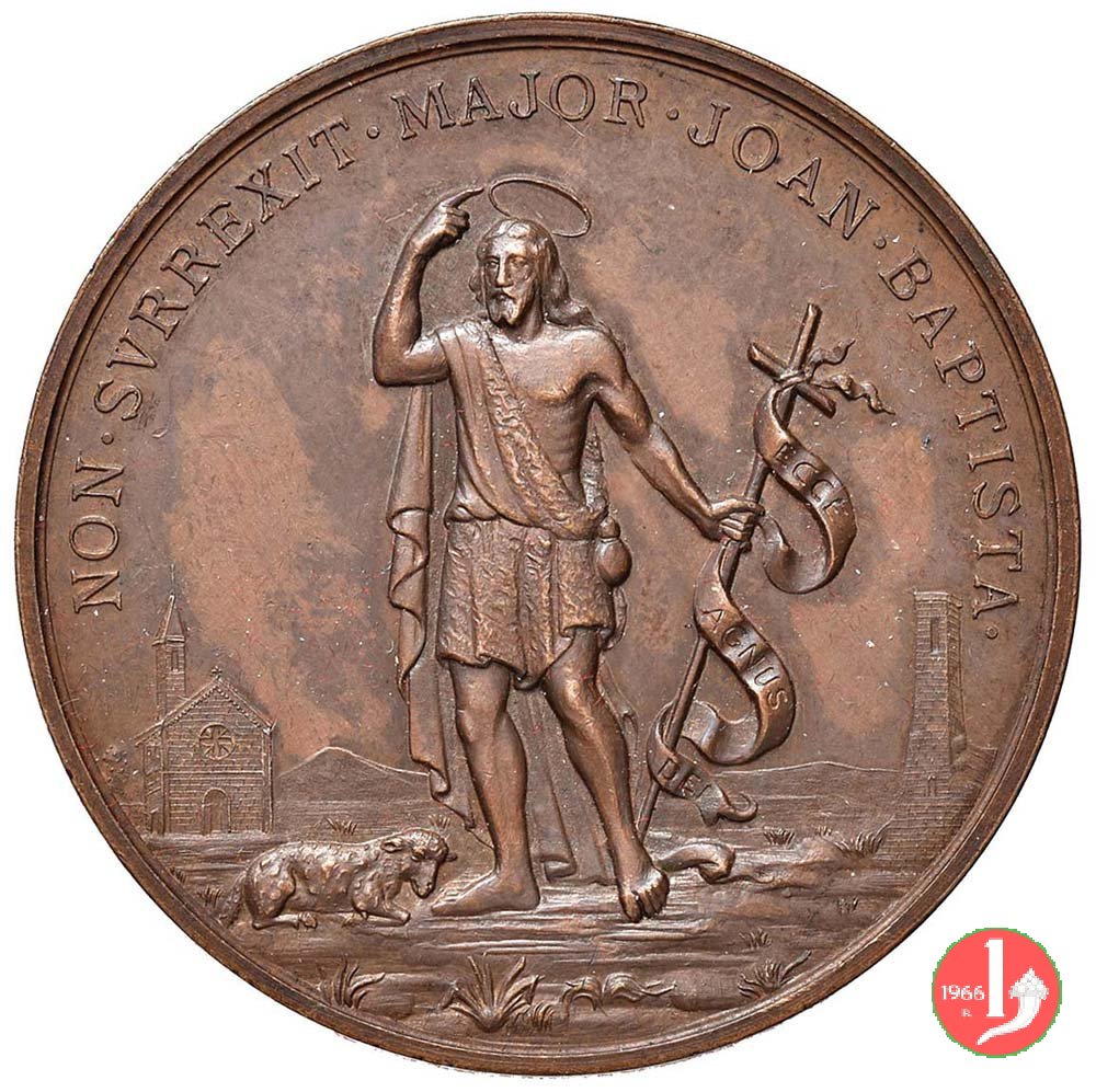 Lonato - 1900° San Giovanni Battista 1893 Obverse: NON • SVRREXIT • MAJOR • JOAN • BAPTISTA • San Giovanni in piedi e nimbato regge Croce con nastro: ECCE _ AGNVS _ DEI ai suoi piedi: agnello disteso sullo sfondo: Chiesetta e torre entro cornice circolare interrotta in basso dall'esergo: Vista della Chiesa della Natività di San Giovanni Battista in Lonato in basso a dx: JOHNSON in esergo ai lati di stemma LIBERTAS: S. GIOV. _ BATTA | |