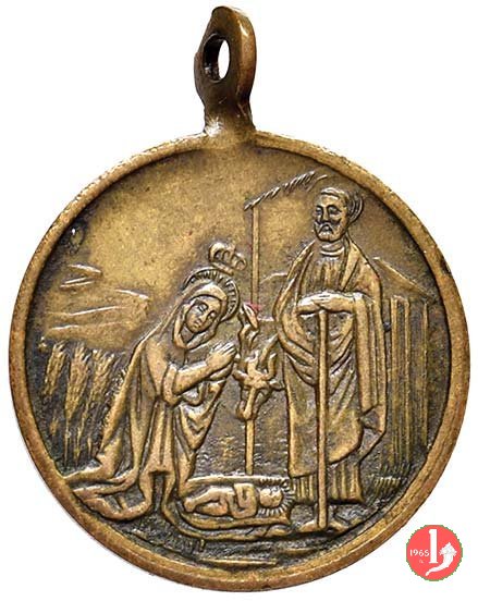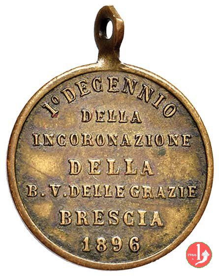 10° Incoronazione B. V. delle Grazie 1896 Obverse: Scena della natività con la B. V. Maria genuflessa ed orante il Bambino, San Giuseppe in piedi e sullo sfondo il bue e l'asino Reverse: I° DECENNIO nel campo: DELLA = INCORONAZIONE = DELLA = B.V. DELLE GRAZIE = BRESCIA = 1896 | |