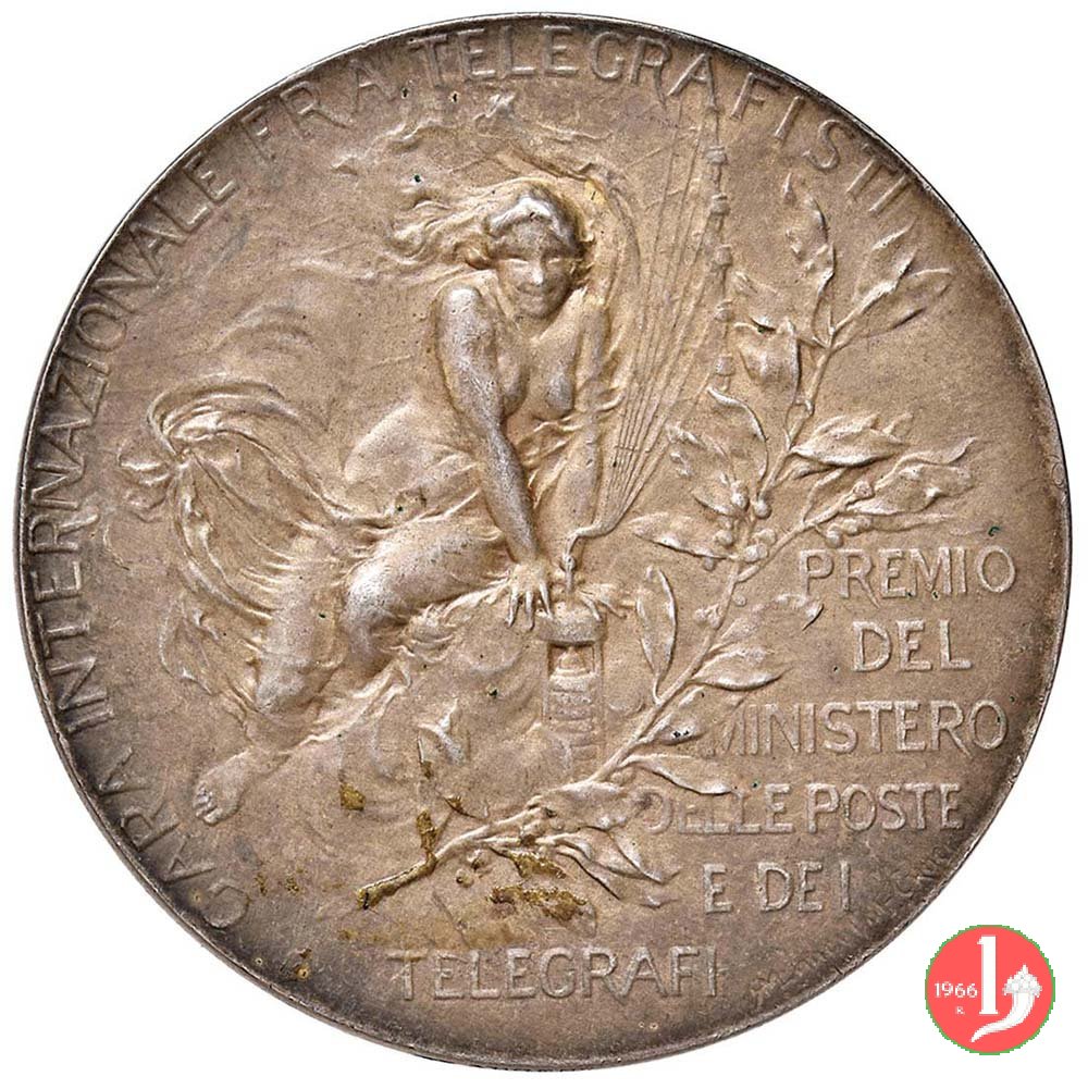 Alessandro Volta - 100° della Pila Gara Telegrafisti 1899 Obverse: PRIMO CENTENARIO DELLA SCOPERTA DELLA PILA • COMO • MDCCCXCIX busto di Volta a sx con giacca e foulard nel campo a dx in monogramma: LCMR figura femminile allegorica dell'energia elettrica regge pila da cui fuoriescono fili presso ramo d'alloro nel campo a dx: PREMIO = DEL = MINISTERO = DELLE POSTE = E DEI = TELEGRAFI | |