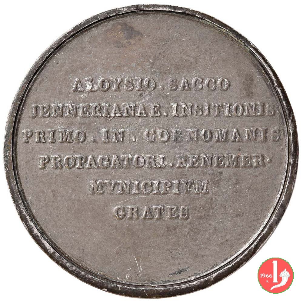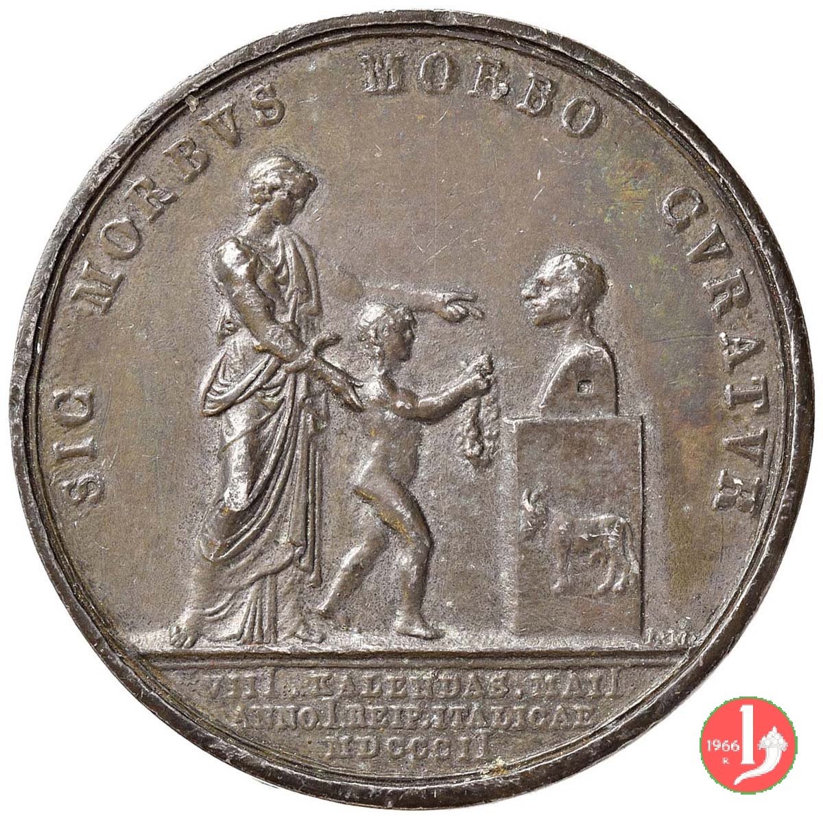 Luigi Sacco 1802 -B216 Obverse: SIC MORBVS MORBO CVRATVR Madre in piedi e volta a dx sprona bimbo a deporre ghirlanda su busto con alla base capra in basso a dx: L.M. in esergo: VIII • KALENDAS • MAII = ANNO • I • REIP • ITALICAE = MDCCCII | |