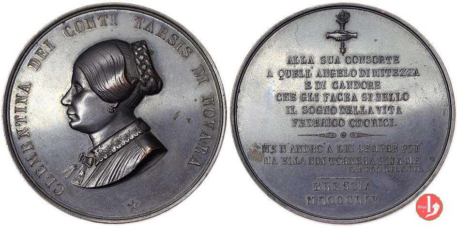 Clementina dei Conti di Novara 1854 Obverse: CLEMENTINA DEI CONTI TARSIS DI NOVARA * Busto a sx con camicia e capelli raccolti dietro la nuca sotto: L. CORTER F. nel campo: ALLA SUA CONSORTE = A QUELL'ANGELO DI NITEZZA = E DI CANDORE = CHE GLI FACEA SI BELLO = IL SOGNO DELLA VITA = FEDERICO ODORICI = - • - = ME N'ANDRO' A LEI SEMPRE PIU' = MA ELLA NON TORNERA' PIU' A ME = BRESCIA = MDCCCLIV | |