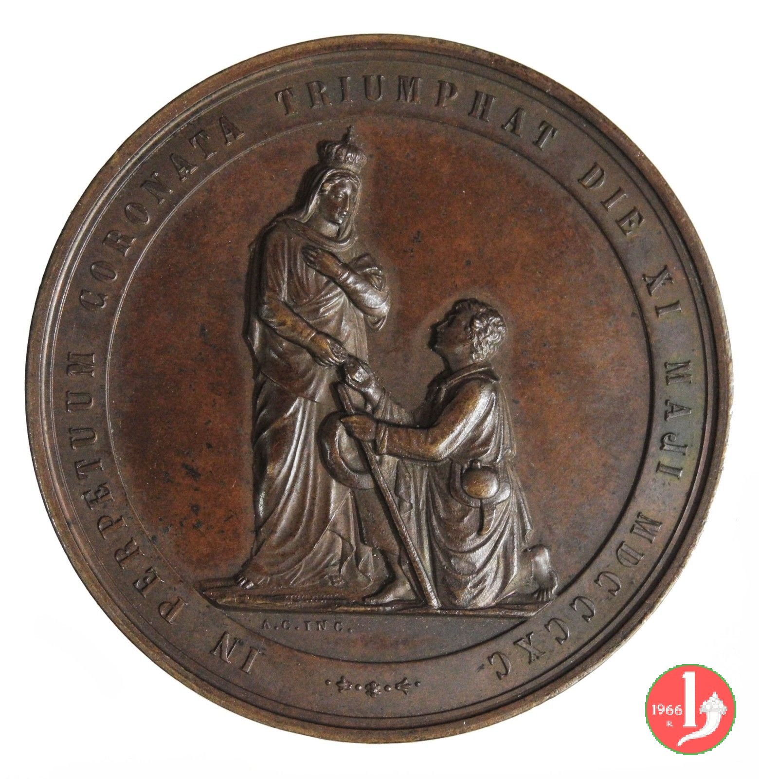 Madonna della Stella 1890 Obverse: IN PERPETUUM CORONATA TRIUMPHAT DIE XI MAII MDCCCXC. la Beata Vergine Maria coronata, in piedi e volta a dx porge la mano a pastore genuflesso (antonio de Antoni) con basotone e cappello in esergo: A.C. INC. Vista del Santuario in esergo: JOHNSON - MILANO | |