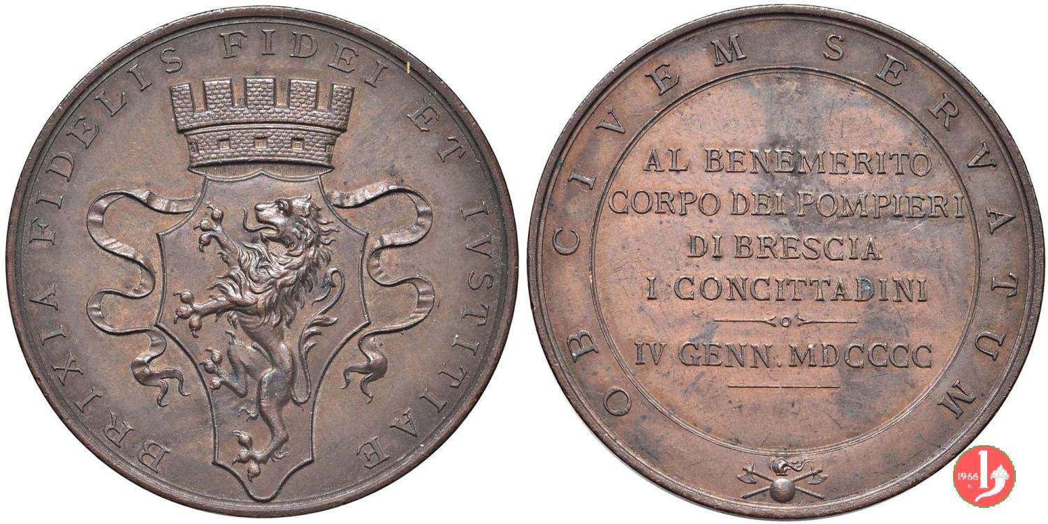 Corpo dei Pompieri 1900 Obverse: BRIXIA FIDEI FIDEI ET IVSTITAE Stemma turrito della città di Brescia (leone rampante a sx) tra nastri nel campo entro cerchio continuo: AL BENERITO = CORPO DEI POMPIERI = DI = BRESCIA = I CONCITTADINI = - • - = IV GENN. MDCCCC in basso: Miccia ardente su scuri decussate | |