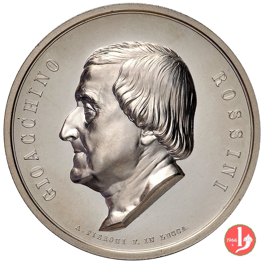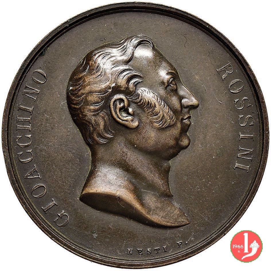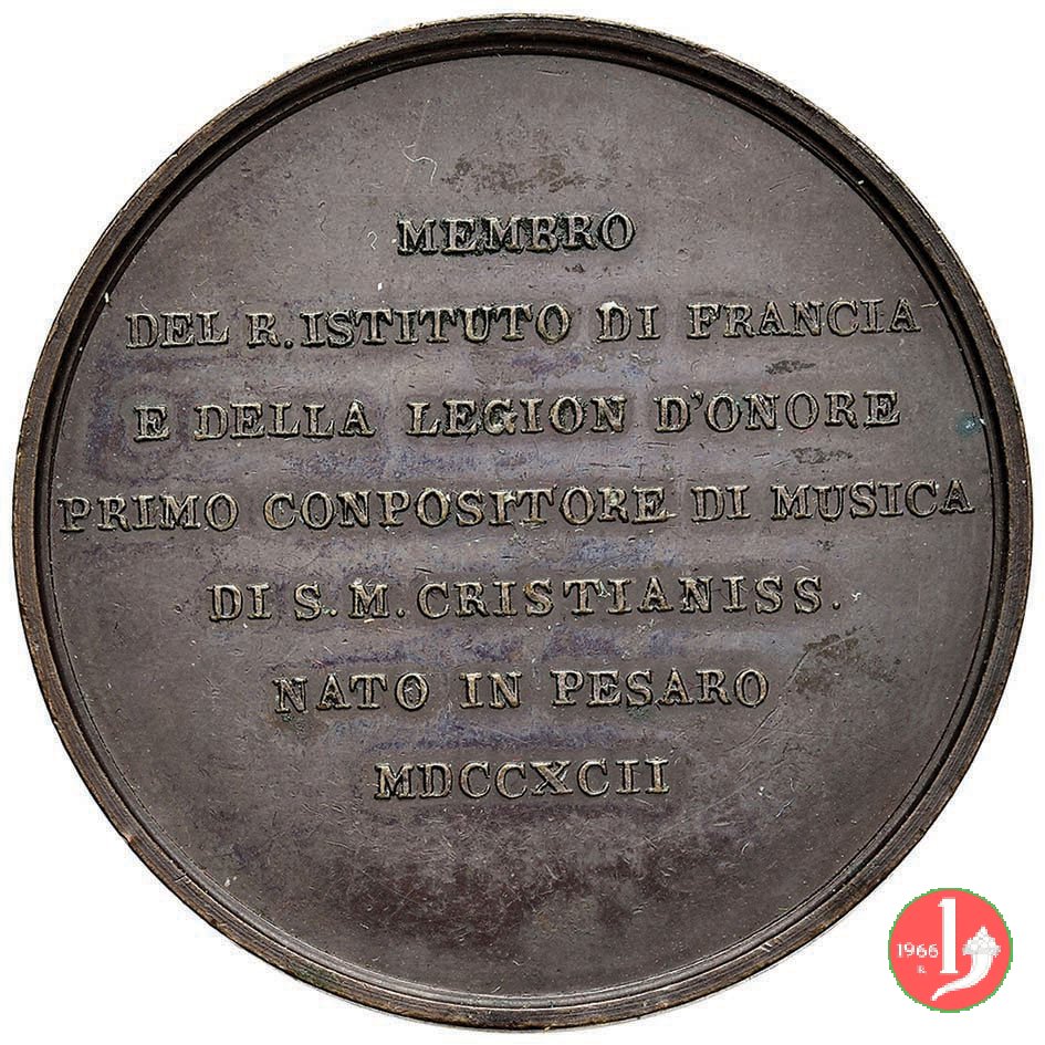 Verso: nel campo: MEMBRO = DEL R. ISTITUTO DI FRANCIA = E DELLA LEGION D'ONORE = PRIMO COMPOSITORE DI MUSICA = DI S. M. CRISTIANISS. = NATO IN PESARO = MDCCXCII