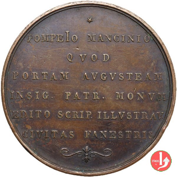 Verso: nel campo: * = POMPEIO MANCINIO = QVOD = PORTA AVGVSTEAM = INSIGN. PATR. MONVM. = EDITO SCRIPT. ILLVSTRV. = CIVITAS FANESTRIS = fregio