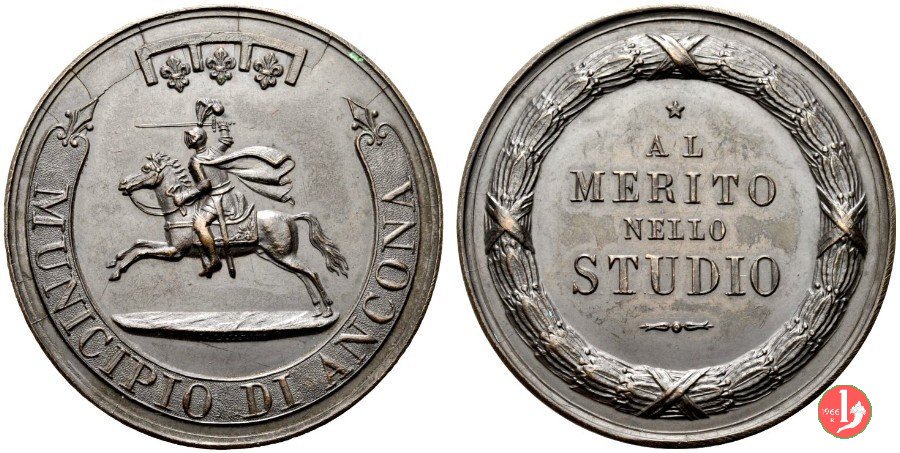 Verso: nel campo, entro rami d'alloro legati in basso da nastro: ONORIAMO = LE = ARTI