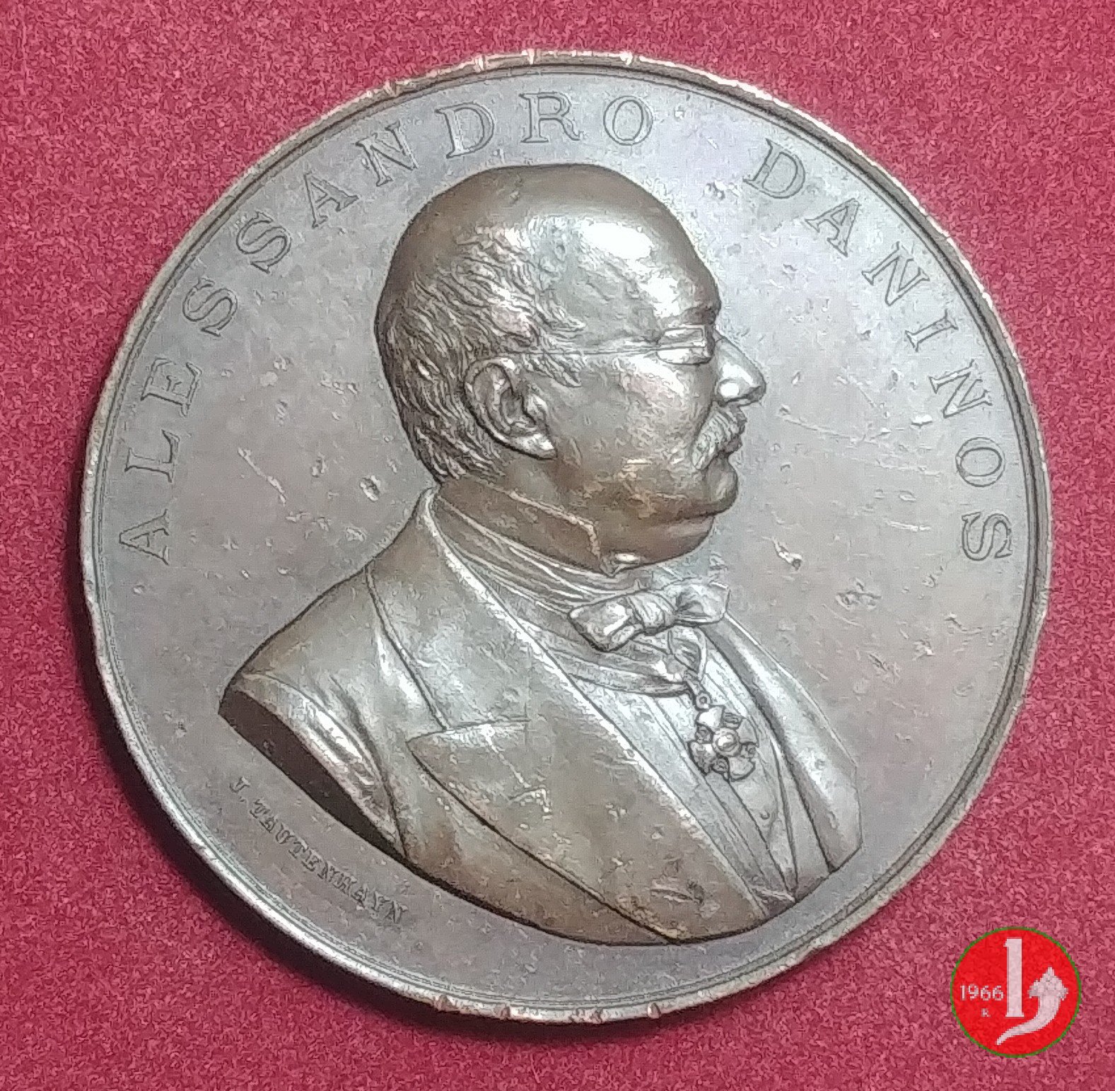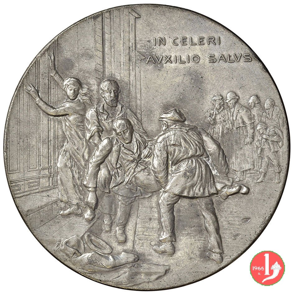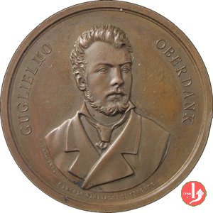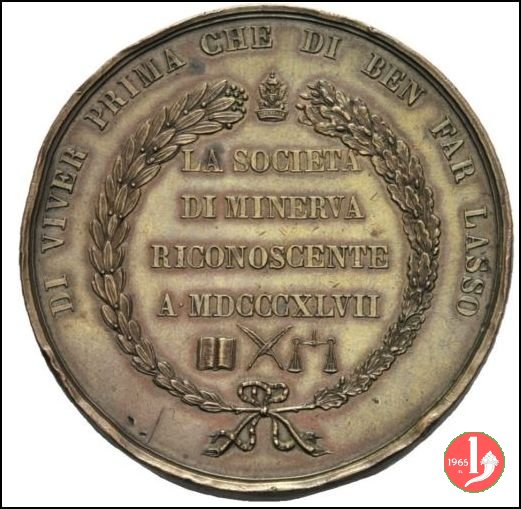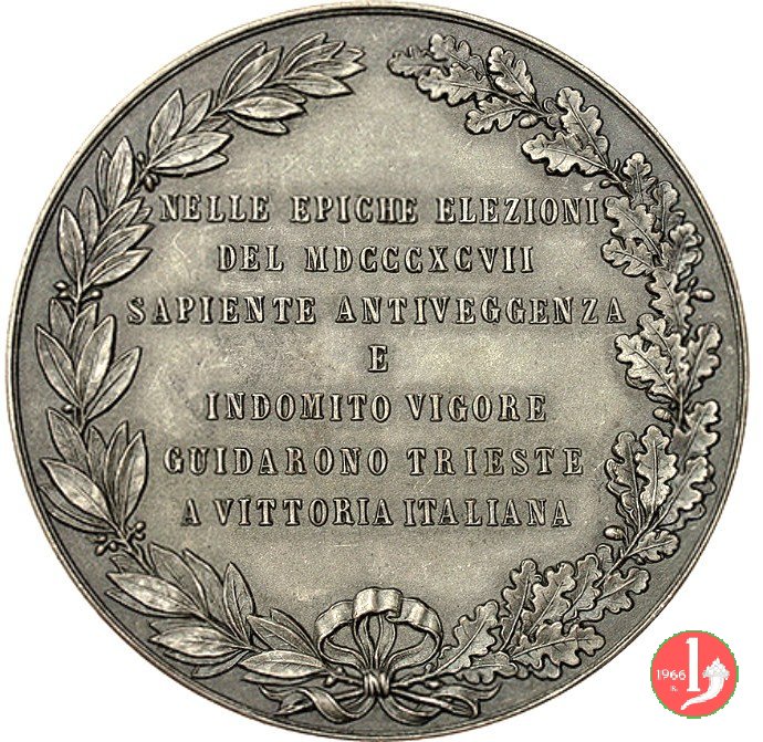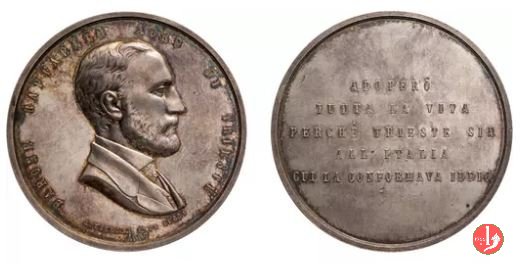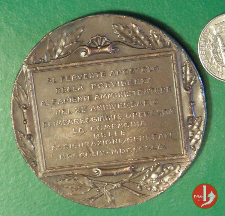 Verso: nel campo, entro targa, su rami d'alloro e quercia: AL FERVENTE APOSTOLO = DELLA PREVIDENZA = AL SAPIENTE AMMINISTRATORE = NEL XL° • = ANNIVERSARIO = DI IMPAREGGIABILE OPEROSITA' = LA COMPAGNIA = DELLE = ASSICURAZIONI GENERALI = MDCCCLIX-MDCCCXCIX