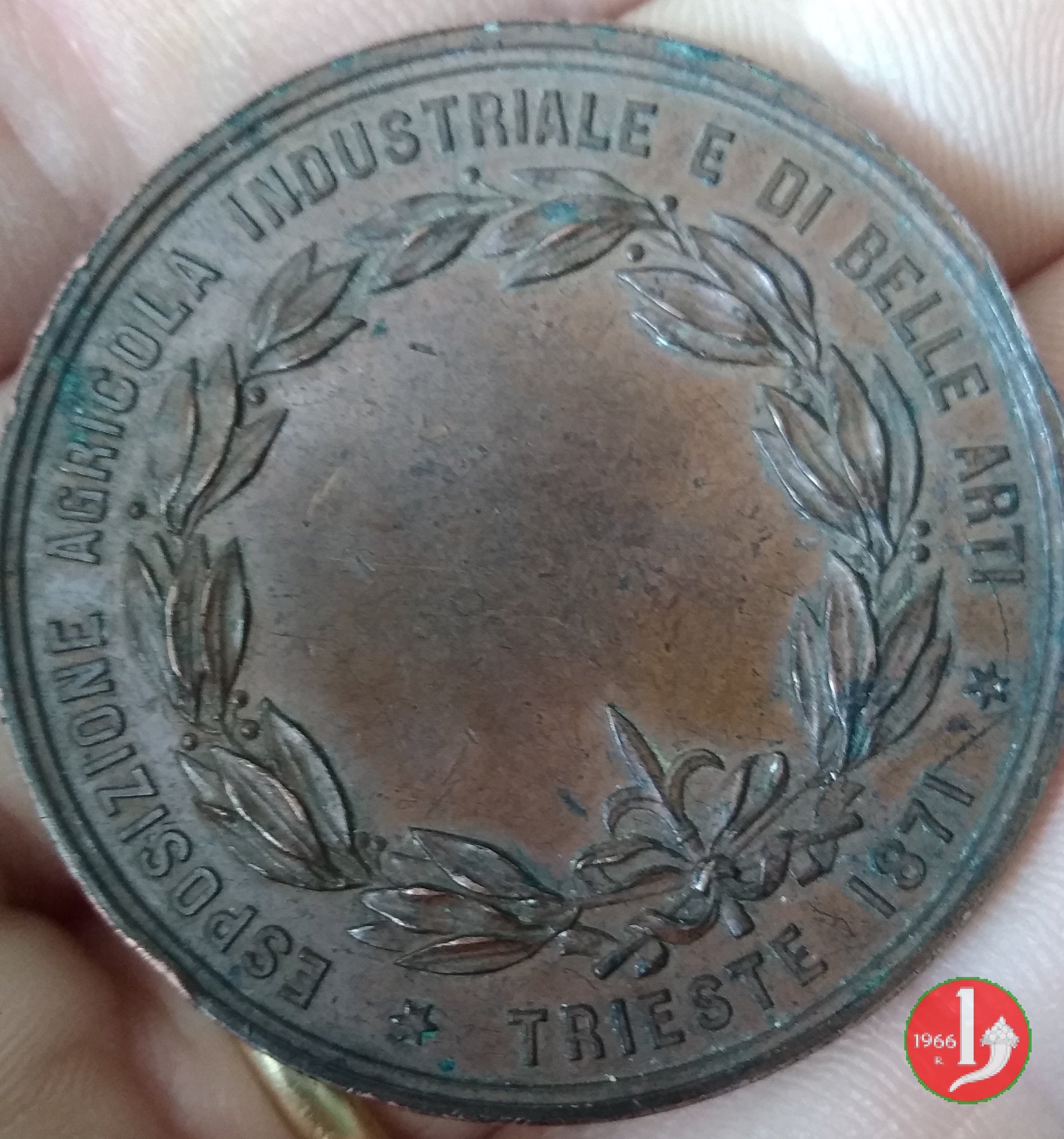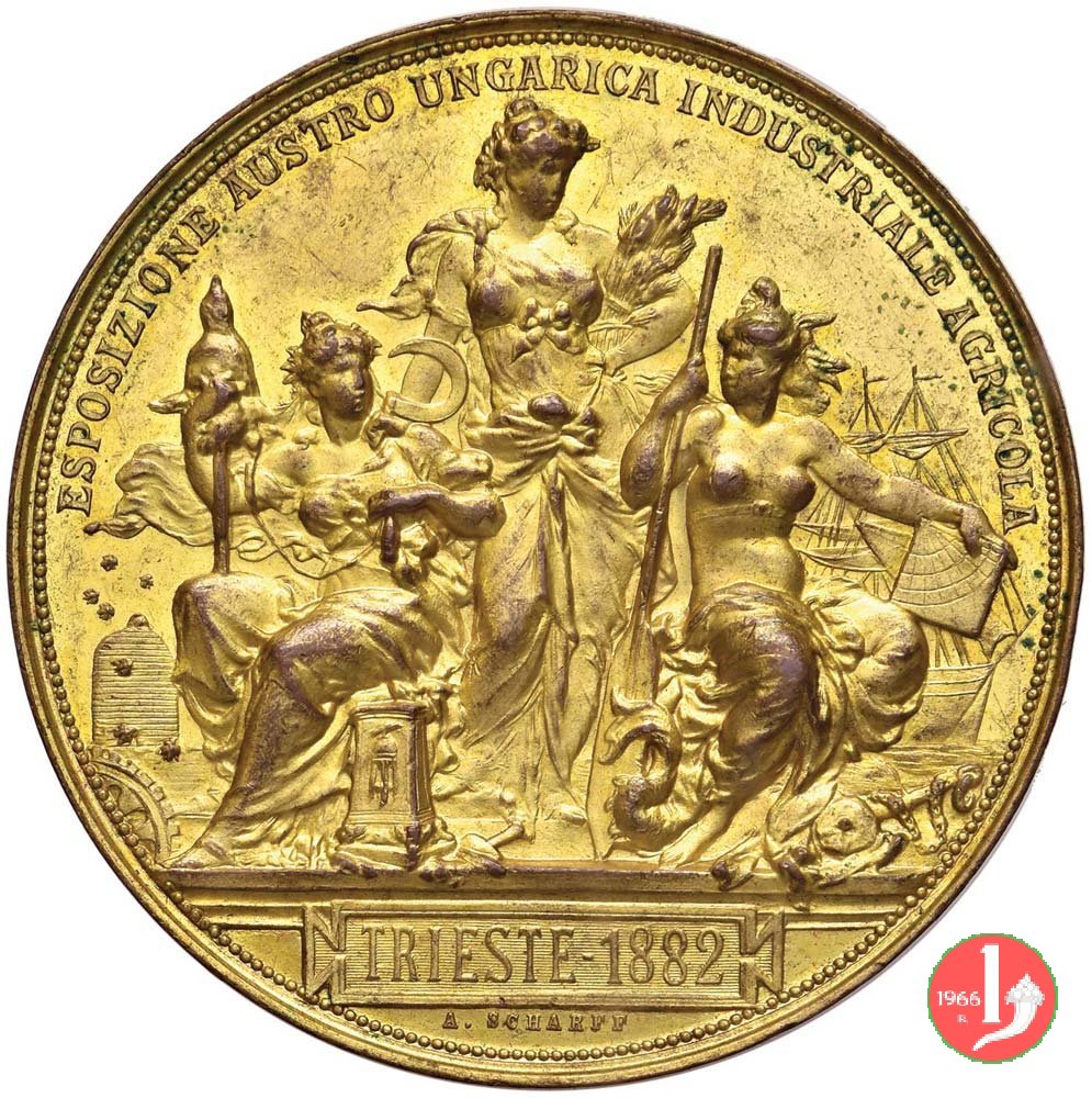 entro cerchio perlinato: Figura femminile allegorica di Trieste, regge scudo con giglio triestino e protende serto d'alloro su vari prodotti industriali