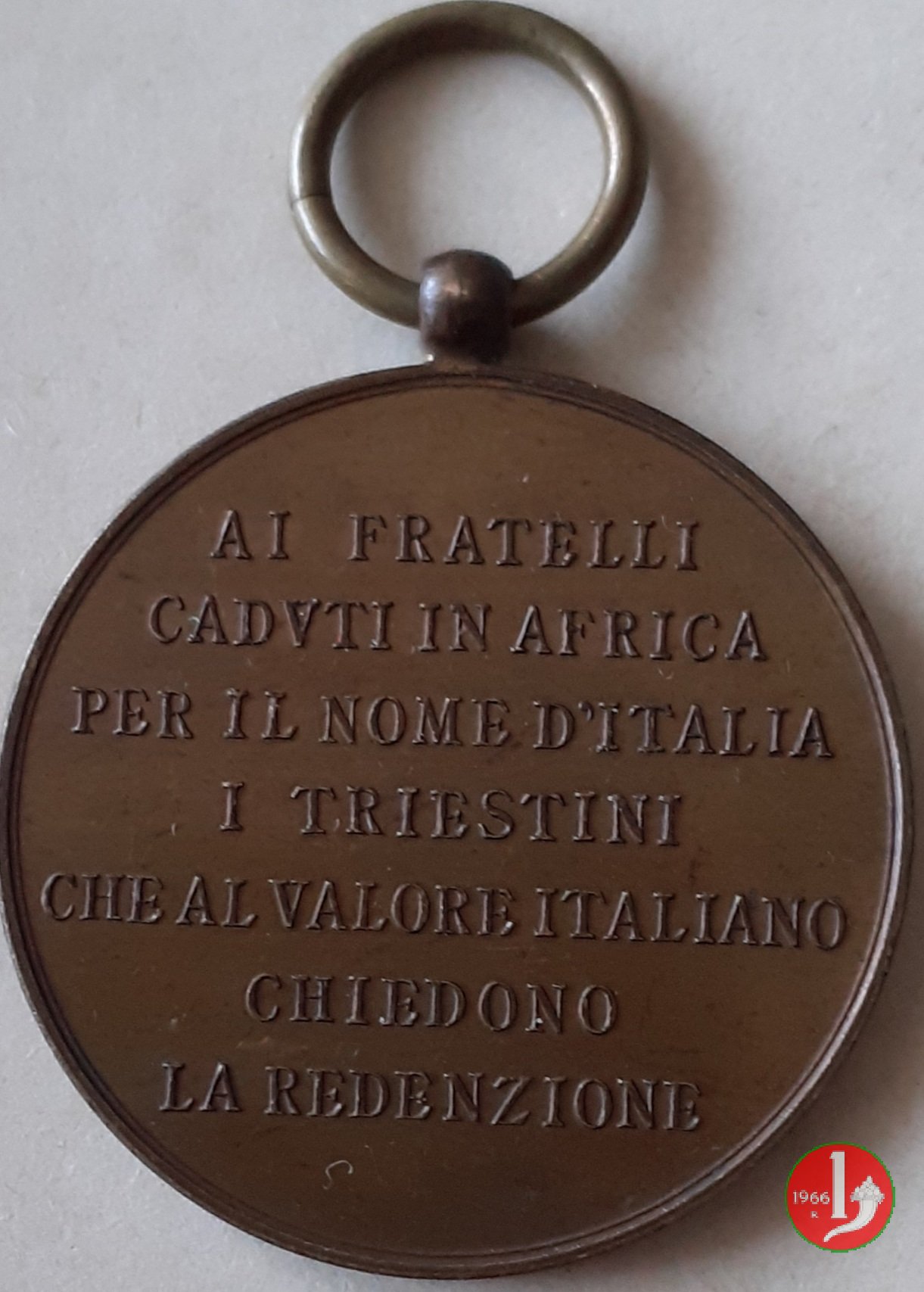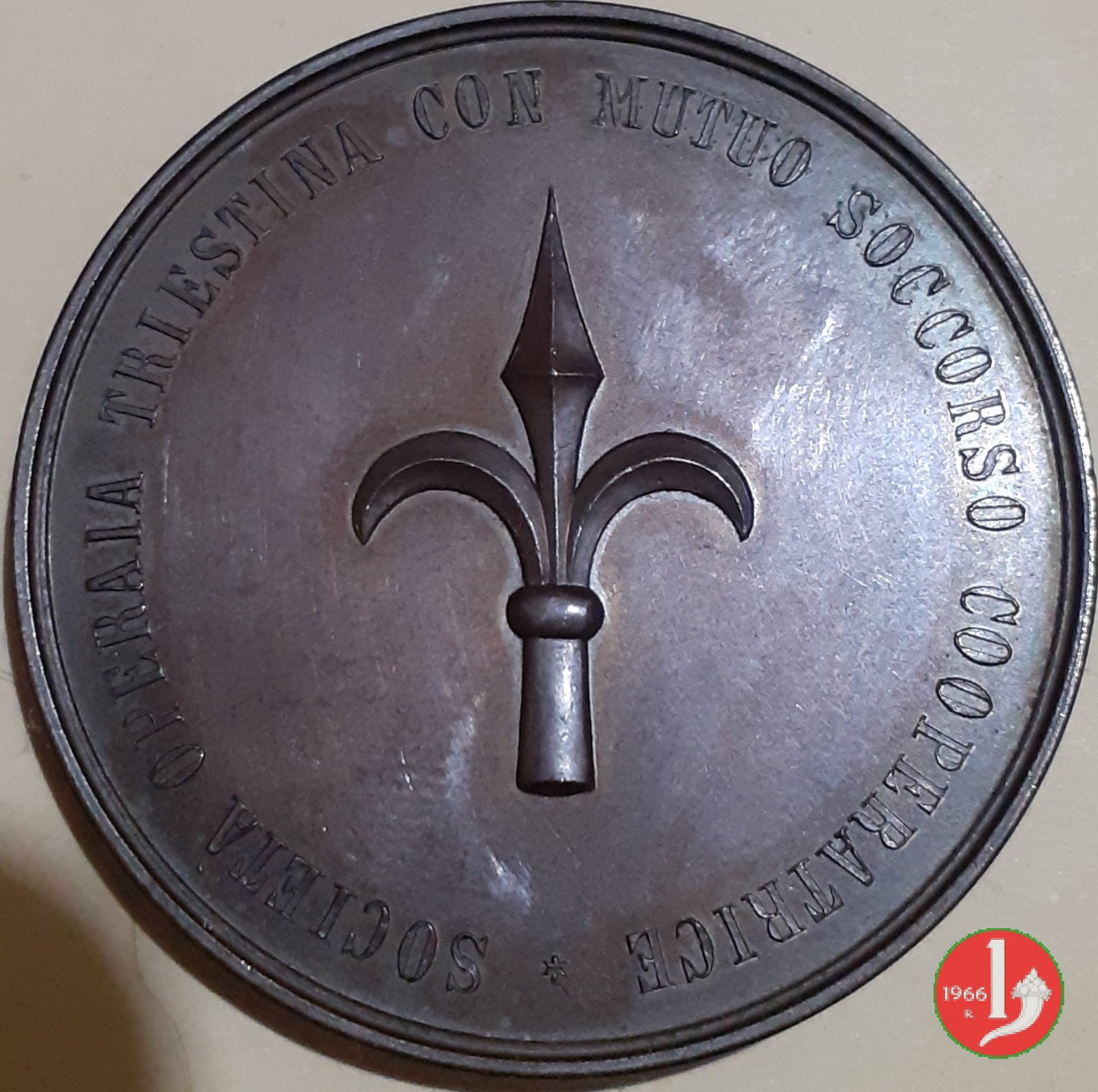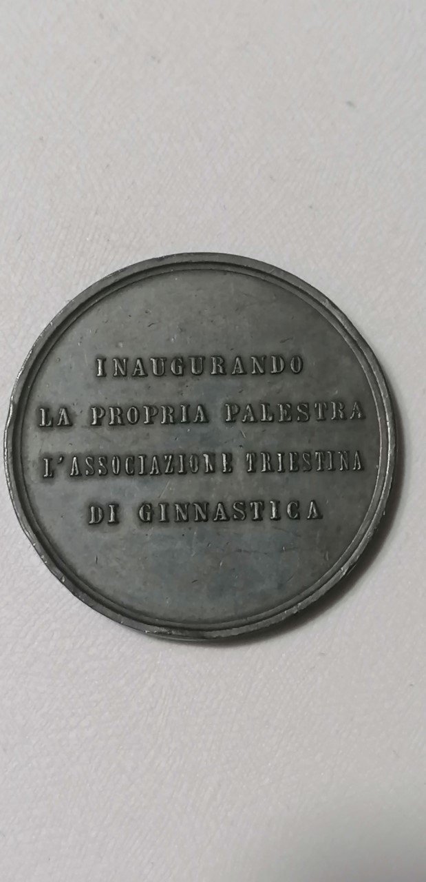 Dritto: entro nastro disposto circolarmente lungo il bordo superiore: CENTENARIO DELLA SOCIETÀ TRIESTINA DI _ BERSAGLIERI