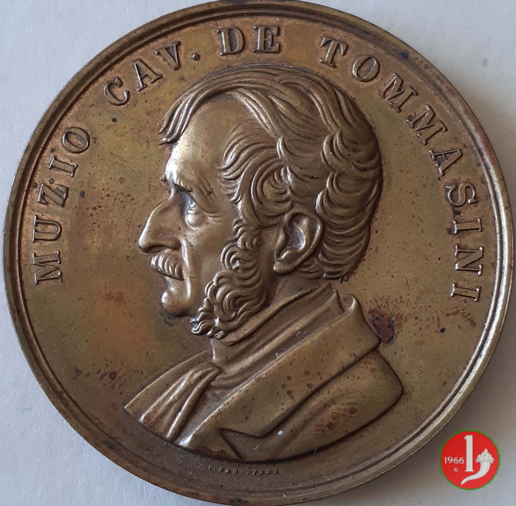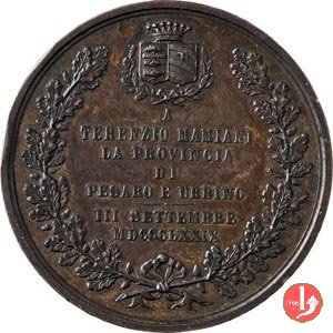 Verso: nel campo, tra rami di quercia, legati in basso da nastro: Stemmi affiancati e coronati su rami d'alloro e quercia di Pesaro e Urbino = A = TERENZIO MAMIANI = LA PRIVINCIA = DI = PESARO E URBINO = - • - = III SETTEMBRE = MDCCCLXXIX