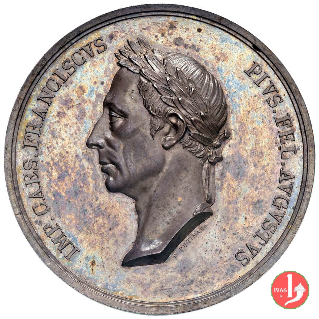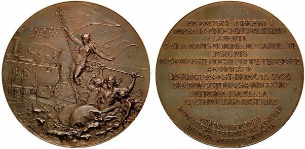 Verso: nel campo: FRANCISCI • IOSEPHI • I • = IMPERII • ANNO • QVINQVAGESIMO = LABENTE = C • ET • R • NAVIS • NOMINE • IMP • CAROLI • VI • = INSIGNIS = IN • NAVALI • STI • ROCHI • PROPE • TERGESTE = AEDIFICATA = IN • FLVCTVS • EST • DEDVCTA • SVOS = DIE • IV • M • OCTOBRIS • A • MDCCCIIC = PATRONA • ISABELLA = ARCHIDVCISSA • AVSTRIAE