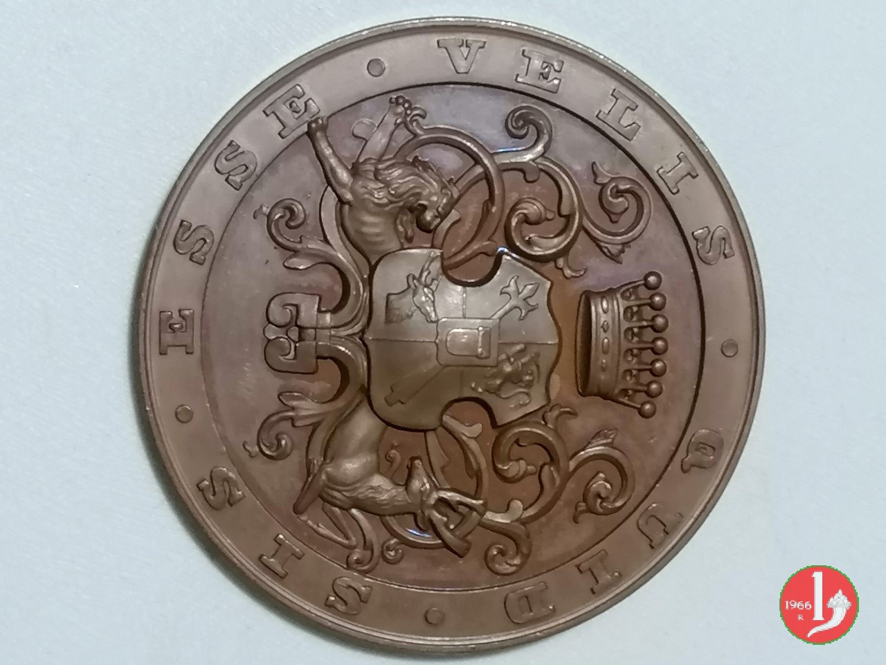 Verso: nel campo, sotto a stella raggiante e con a sx ramo d'alloro : A ENRICO NOE = CHE = IMPRESSE CARATTERE ITALIANO = ALLA = STENOGRAFIA DI GABELSBERGER = DISCEPOLI E AMMIRATORI = IL 18 GIUGNO 1900 = LXV = DALLA SUA NASCITA