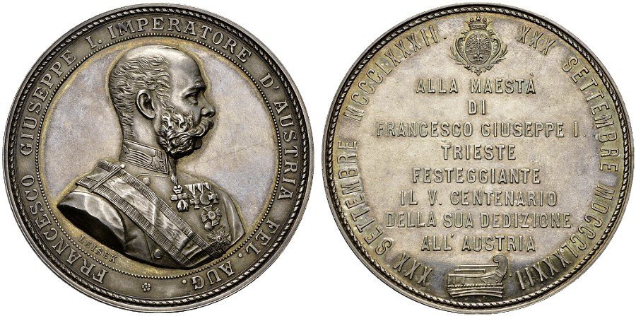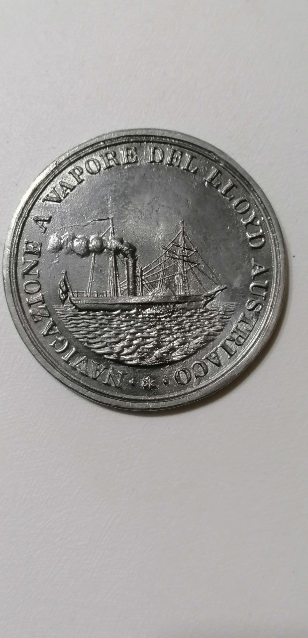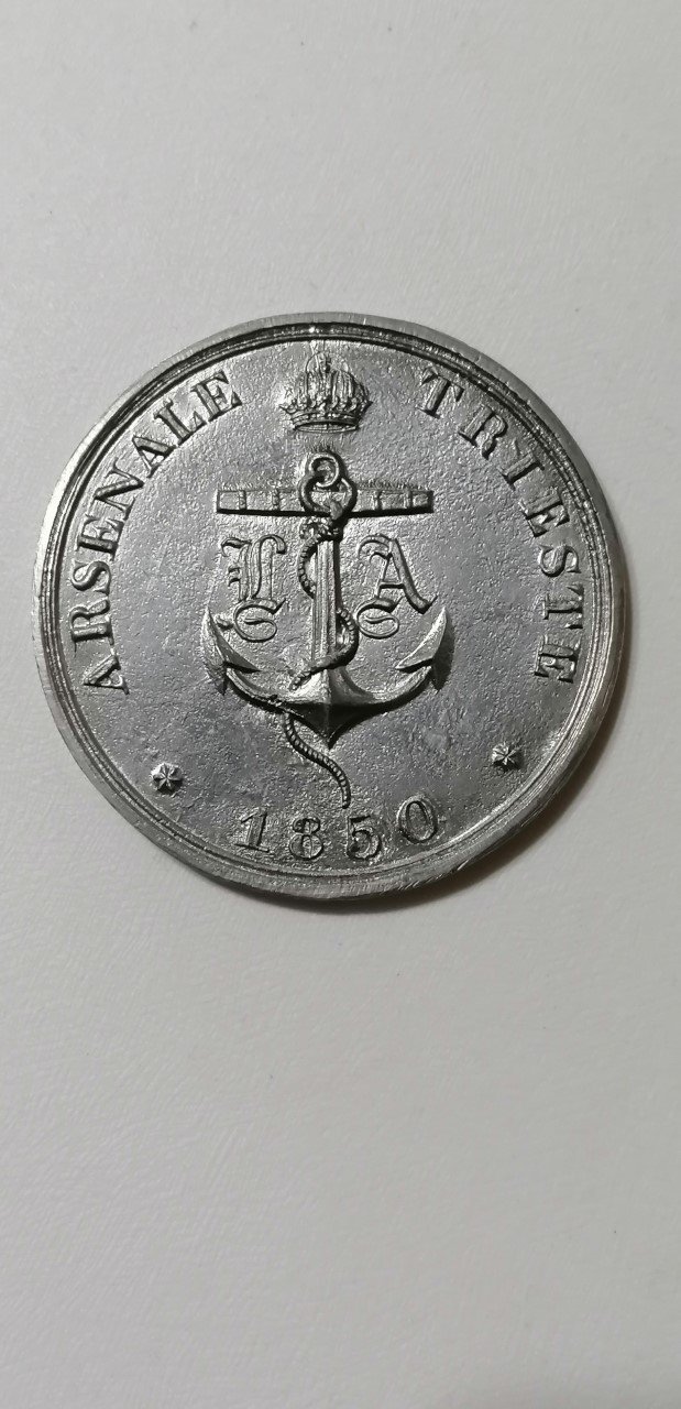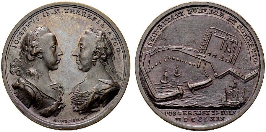 Verso: nel campo: FRANCISCI • IOSEPHII • I = IMPERII • ANNO • QVINQVAGESIMO = LABENTE = C • ET • R • NAVIS • NOMINE • IMP • CAROLI • VI • = AEDIFICATA = IN • FLVCTVS • EST • DEDVCTA • SVOS = DIE • IV • OCTOBRIS • A • MCCCIIC = PATRONA • ISABELLA = ARCHIDVCISSA • AVSTRIAE