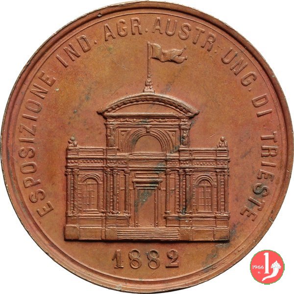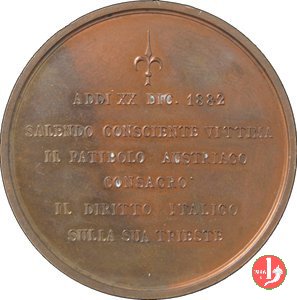 Dritto: Figura allegorica della Città di Trieste, con scudo ai piedi, ai piedi di una scalinata, tra due bracieri ardenti, protende le braccia verso le figure allegoriche delle Città d'Italia sotto ad un portico illuminato da stella raggiante