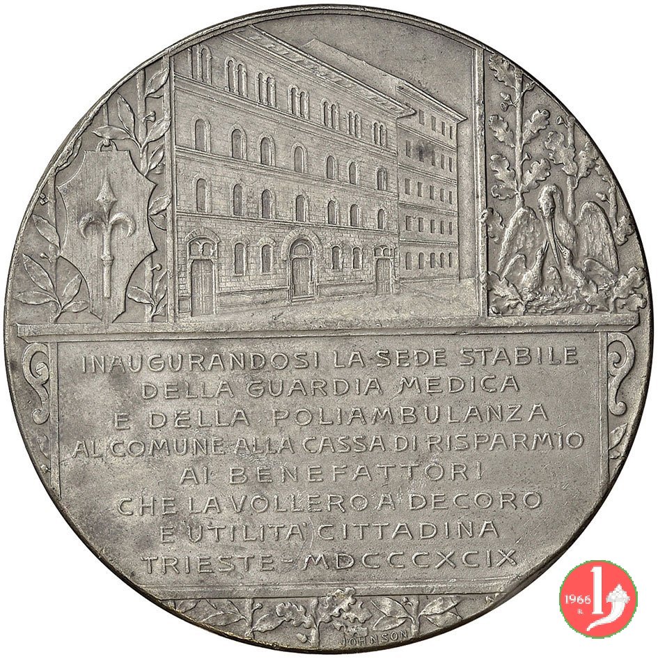 in basso, entro targa su rami d'alloro e di quercia: INAUGURATOSI LA SEDE STABILE = DELLA GUARDIA MEDICA = E DELLA POLIAMBULANZA = AL COMUNE ALLA CASSA DI RISPARMIO = AI BENEFATTORI = CHE VOLLERO A DECORO = E UTILITA' CITTADINA = TRIESTE-MDCCCXCIX