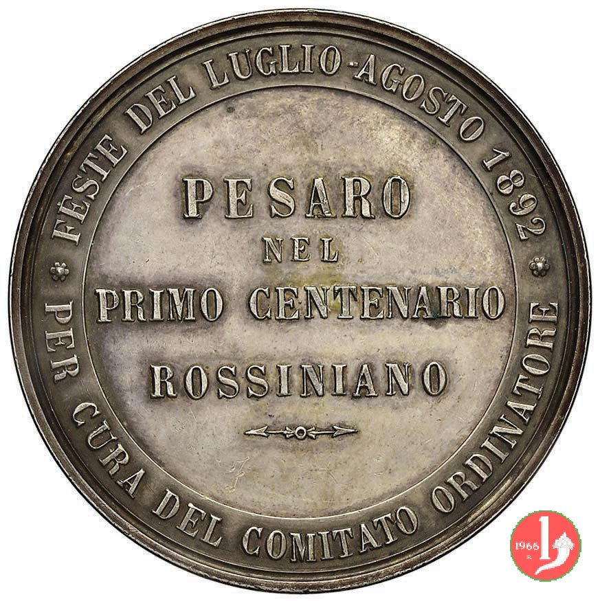 Verso: entro corona di alloro: I° = CENTENARIO = ROSSINIANO = - = PESARO = 1892