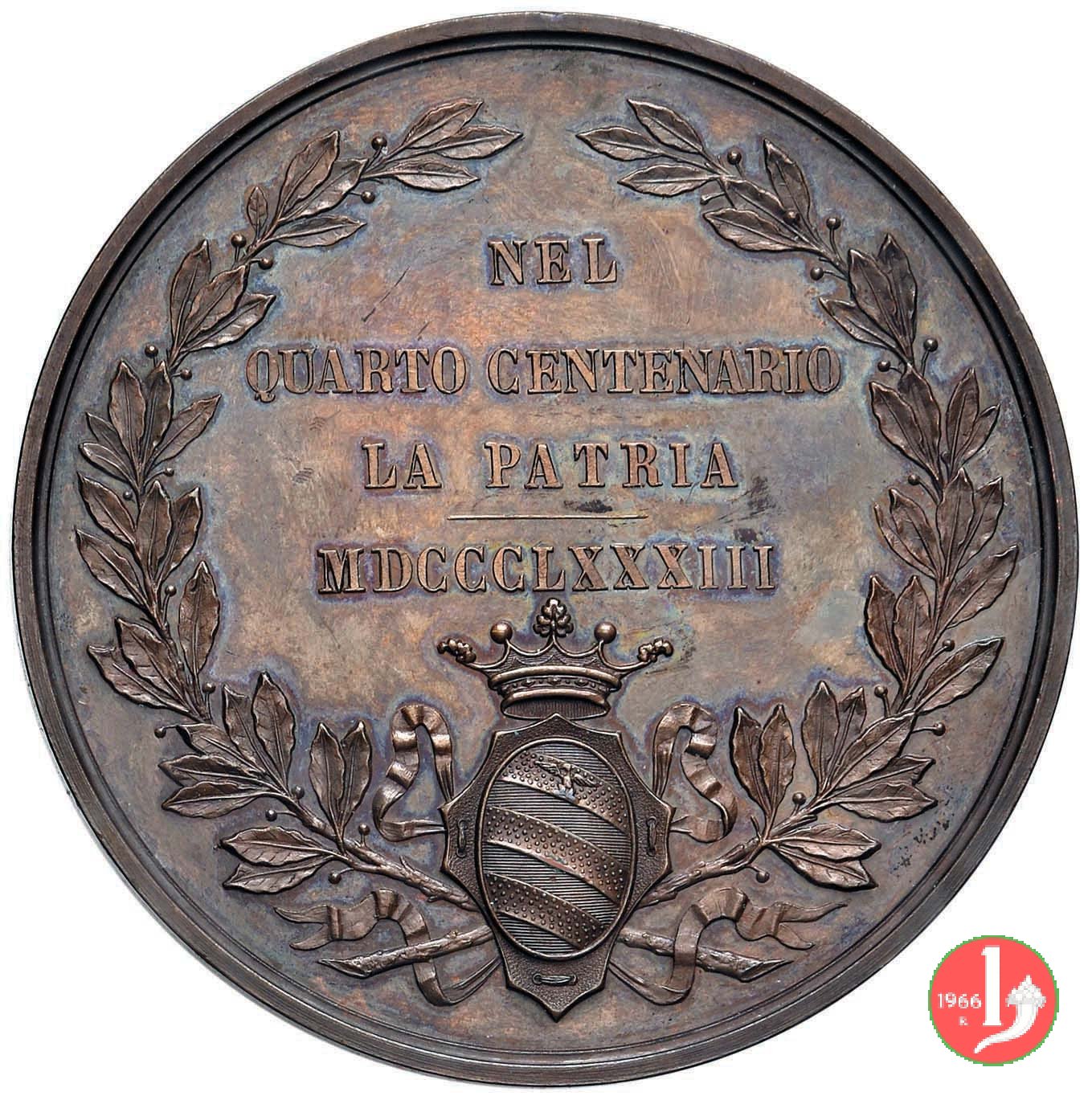 Verso: nel campo, tra rami d'alloro fermati in basso dallo Stemma coronato della città di Urbino: NEL = QUARTO CENTENARIO = LA PATRIA = - = MDCCCLXXXIII