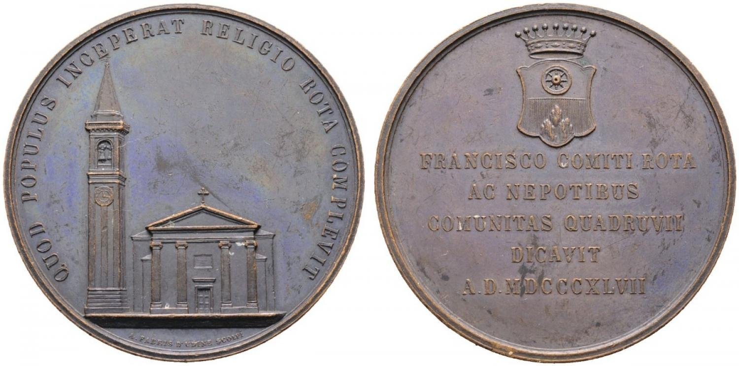 Codroipo - Completamento Chiesa 1847 Obverse: QUOD POPULUS INCEPERAT RELIGIO ROTA COMPLEVIT Propsetto anteriore della Chiesa col Campanile in esergo: A. FABRIS D' UDINE SCOLPI' nel campo: FRANCISCO COMITI ROTA = AC NEPOTIBUS = COMUNITAS QUADRUVII = DICAVIT = A.D. MDCCCXLVII | |