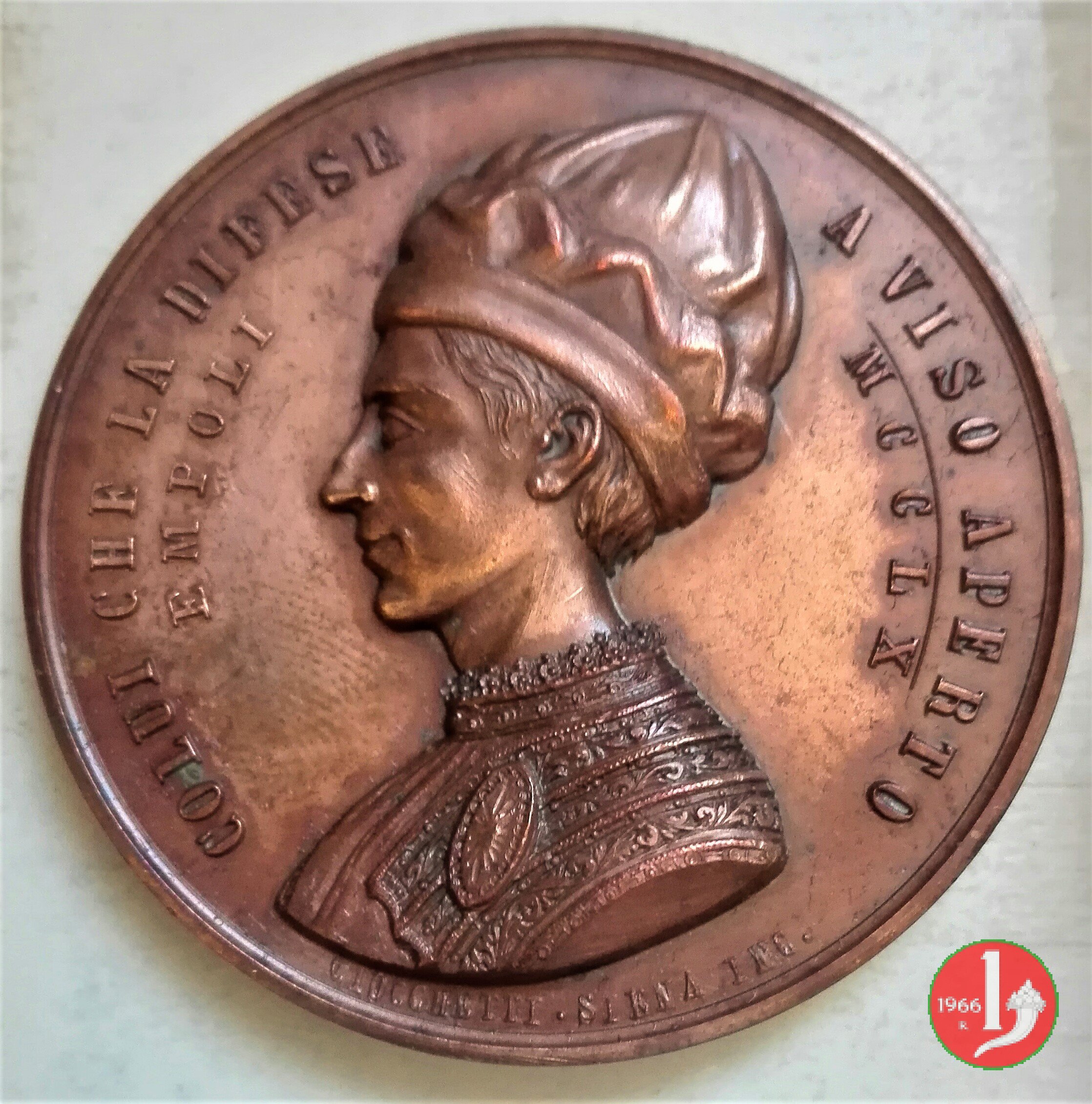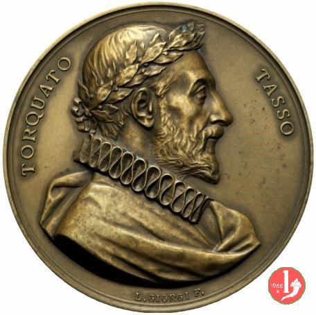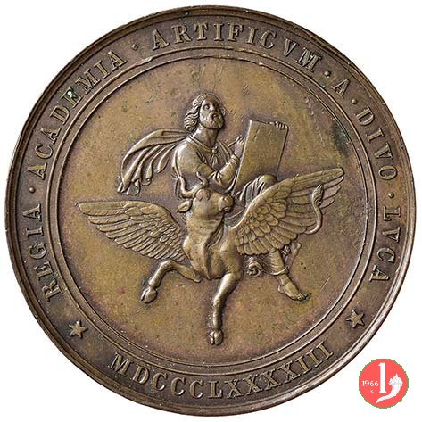 Verso: nel campo: L'ASSOCIAZIONE = ARTISTICA INTERNAZIONALE = DI ROMA = = NEL = IV CENTENARIO DELLA NASCITA = DEL SOMMO MAESTRO = XXVIII  MARZO = MDCCCLXXXIII