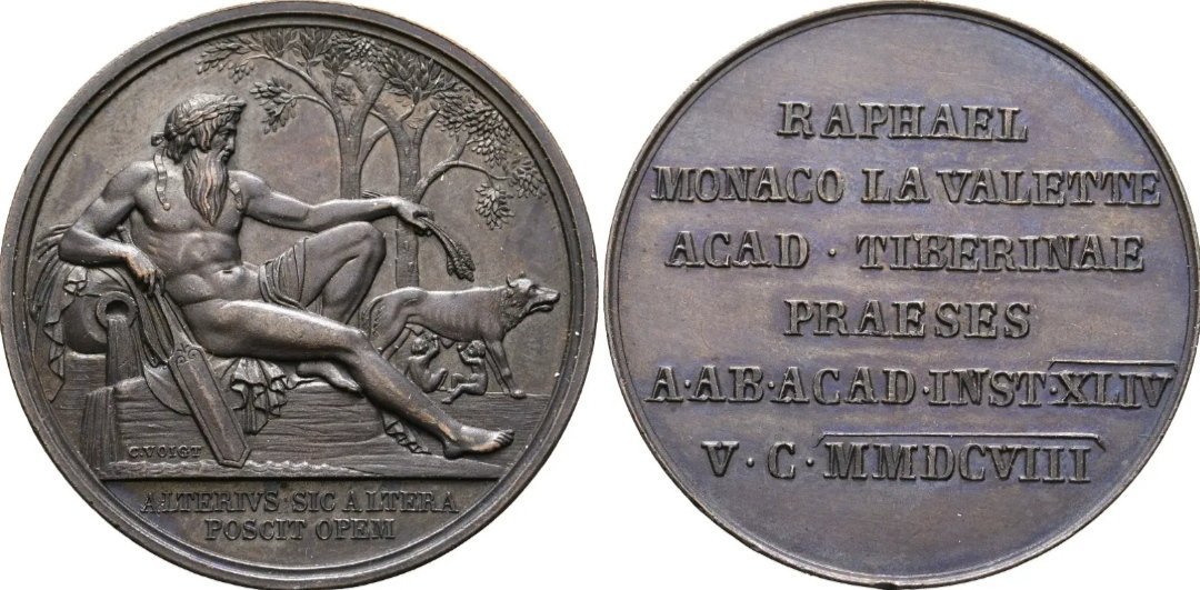 Verso: nel campo: RAPHAEL= MONACO LA VALETTE = ACAD • TIBERINAE = PRAESES = A • AB • ACAD • INST • XLIV  = V • C • MMDCVIII