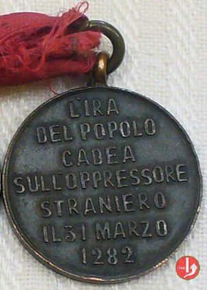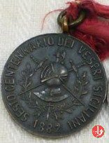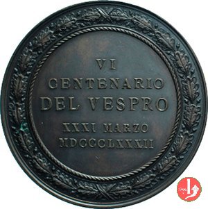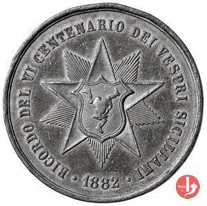 VI Centenario del Vespro 1882 Obverse: Scudetto con trinacria su armi decussate e sormontato da stendardo con VESPO Reverse: VI CENTENARIO DEL VESPRO Nel campo: XXXI MARZO = MDCCCLXXXII in basso: * | |