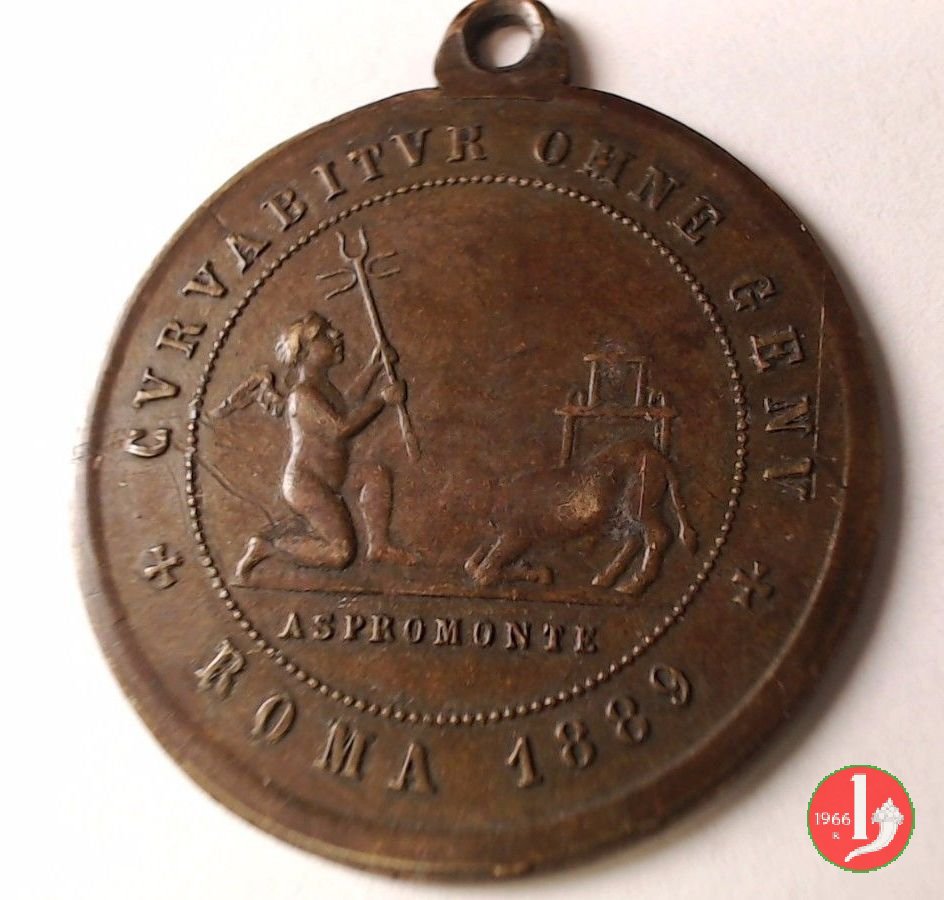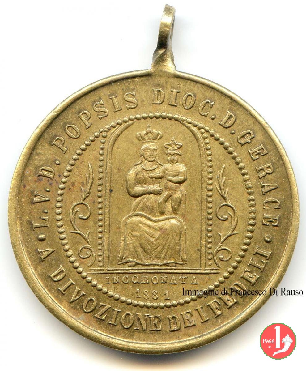 Incoronazione B. V. di Polsi 1881 Obverse: L. V. D. POPSIS DIOC. D. GERACE = • A DIVOZIONE DEI FEDELI • entro cerchio perlinato: La B. V. seduta di fronte con Bambino tra fergi ed entro arcata in esergo: INCORONATA NEL = 1881 entro cerchio perlinato: Putto allato, genuflesso, verso dx e toro genuflesso verso sx in esergo: ASPROMONTE | |