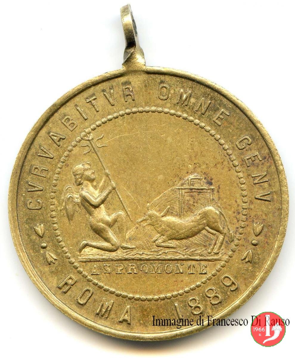 Incoronazione B. V. di Polsi 1881 Obverse: L. V. D. POPSIS DIOC. D. GERACE = + PER CURA DELL'ARMACRI + entro cerchio perlinato: La B. V. seduta di fronte con Bambino tra fregi ed entro arcata in esergo: 1881 entro cerchio perlinato: Putto alato, genuflesso, verso dx e toro genuflesso verso sx in esergo: ASPROMONTE | |