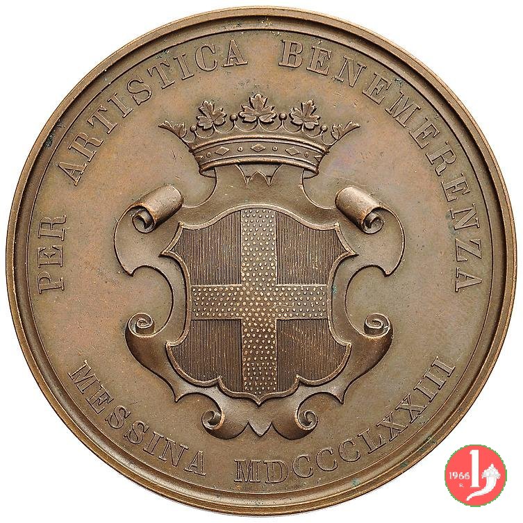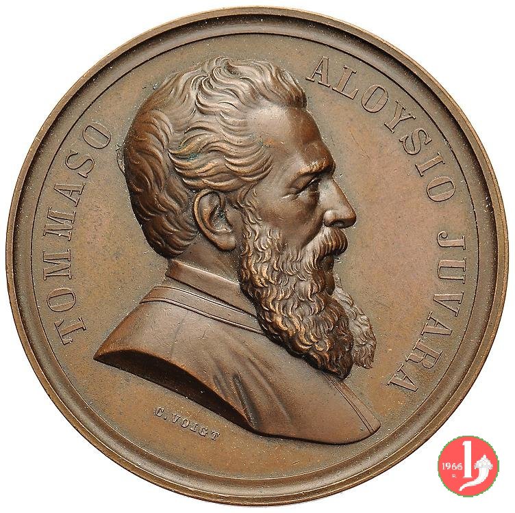Tommaso Luigi Juvara 1873 Obverse: TOMMASO _ ALOYSIO JUVARA busto a dx con lunga barba e camice sotto: C. VOIGHT Stemma coronato entro cartiglio in baso, circolarmente: MESSINA MDCCCLXXIII | |