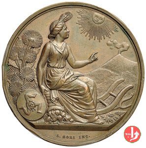 Consorzio Agrario Provincie Siciliane Obverse: Figura allegorica dell'Agricoltura seduta verso dx, mira il sole raggiante ed indica l'Etna, regge cornucopia e scudo con trinacria; sullo sfondo aratro e girasole in esergo: L. GORI INC. tra rami d'alloro e quercia, legati in basso da nastro: dedica e anno (1871) | |